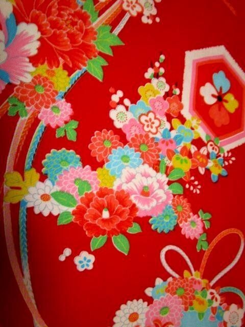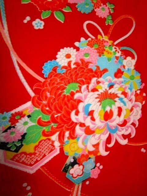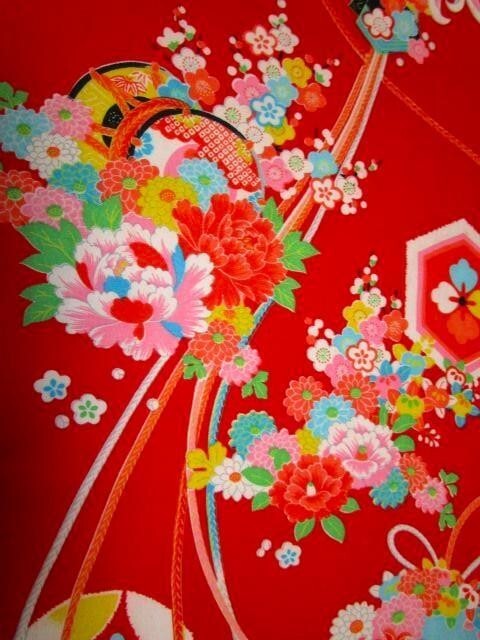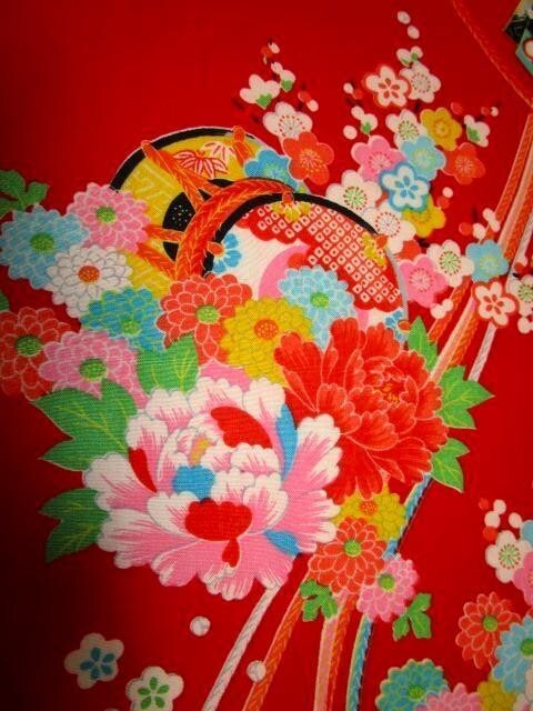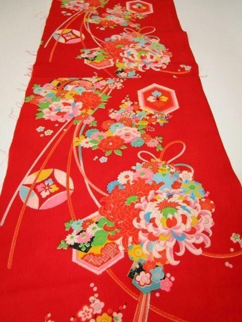 F-14★赤地*鼓*牡丹*菊*椿*梅*ダリア*交織*古布はぎれ★暖簾/タペストリー/一閑張り/夏柄