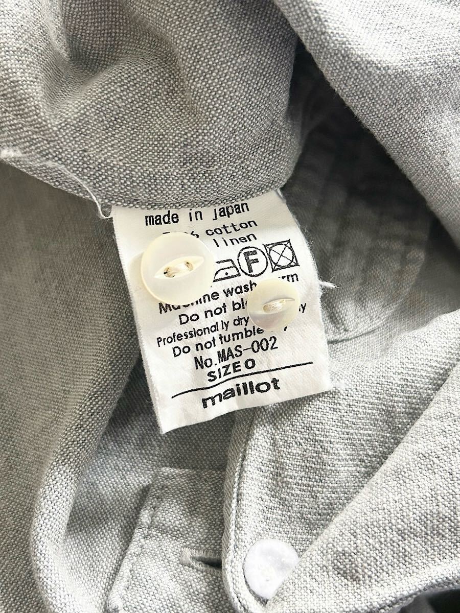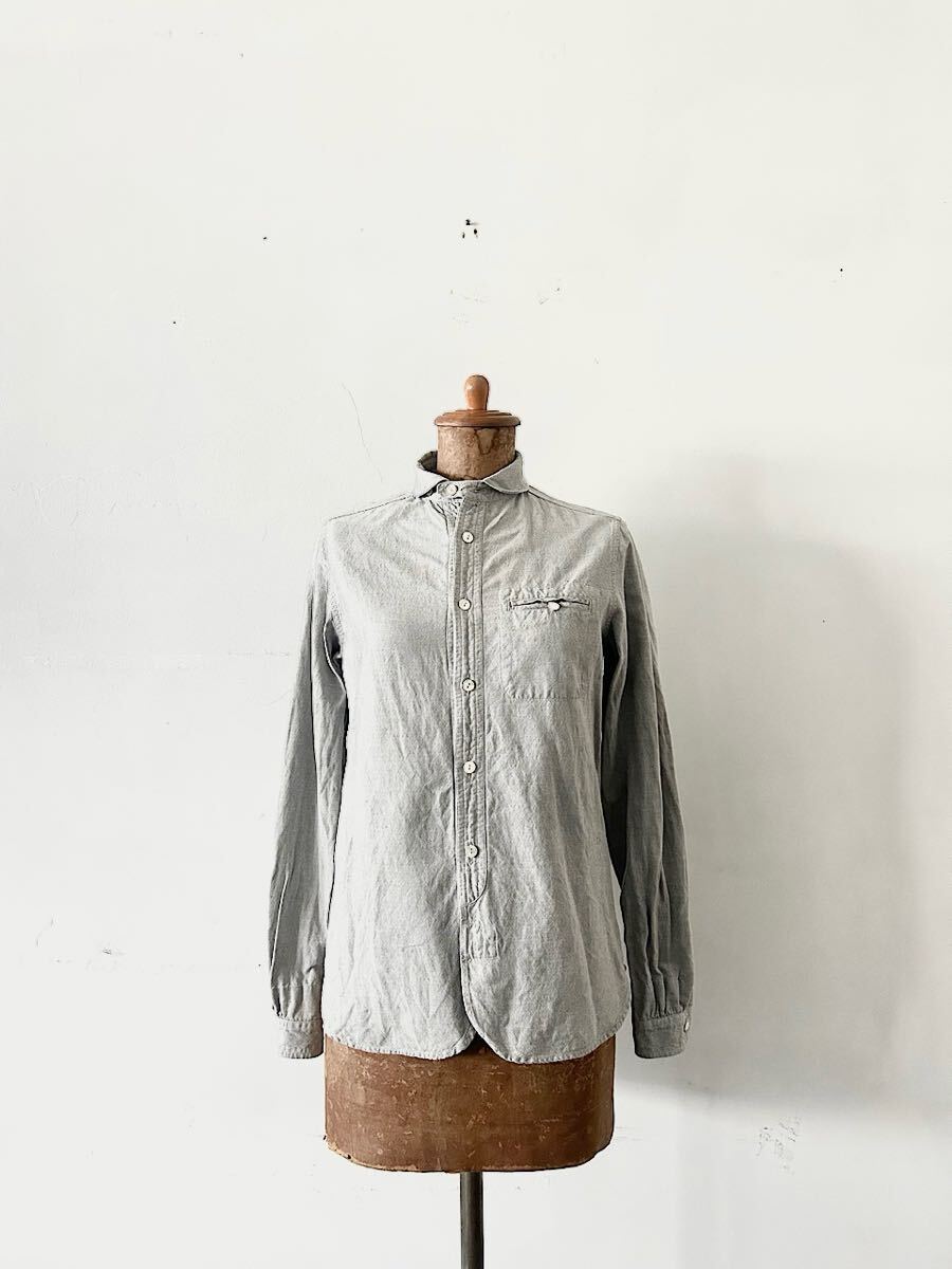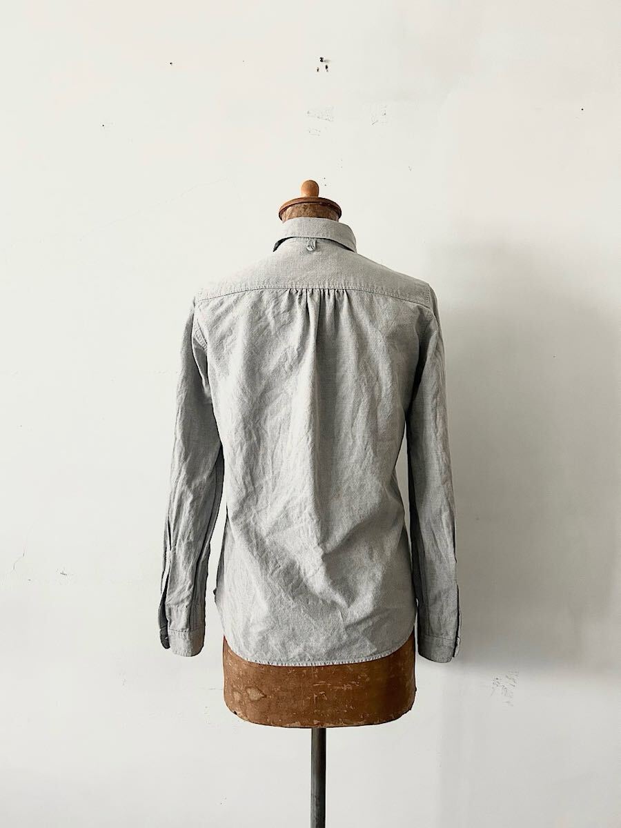 カラーはグレーで、オリジナルコットンリネンシャンブレー地を使用したお品です。