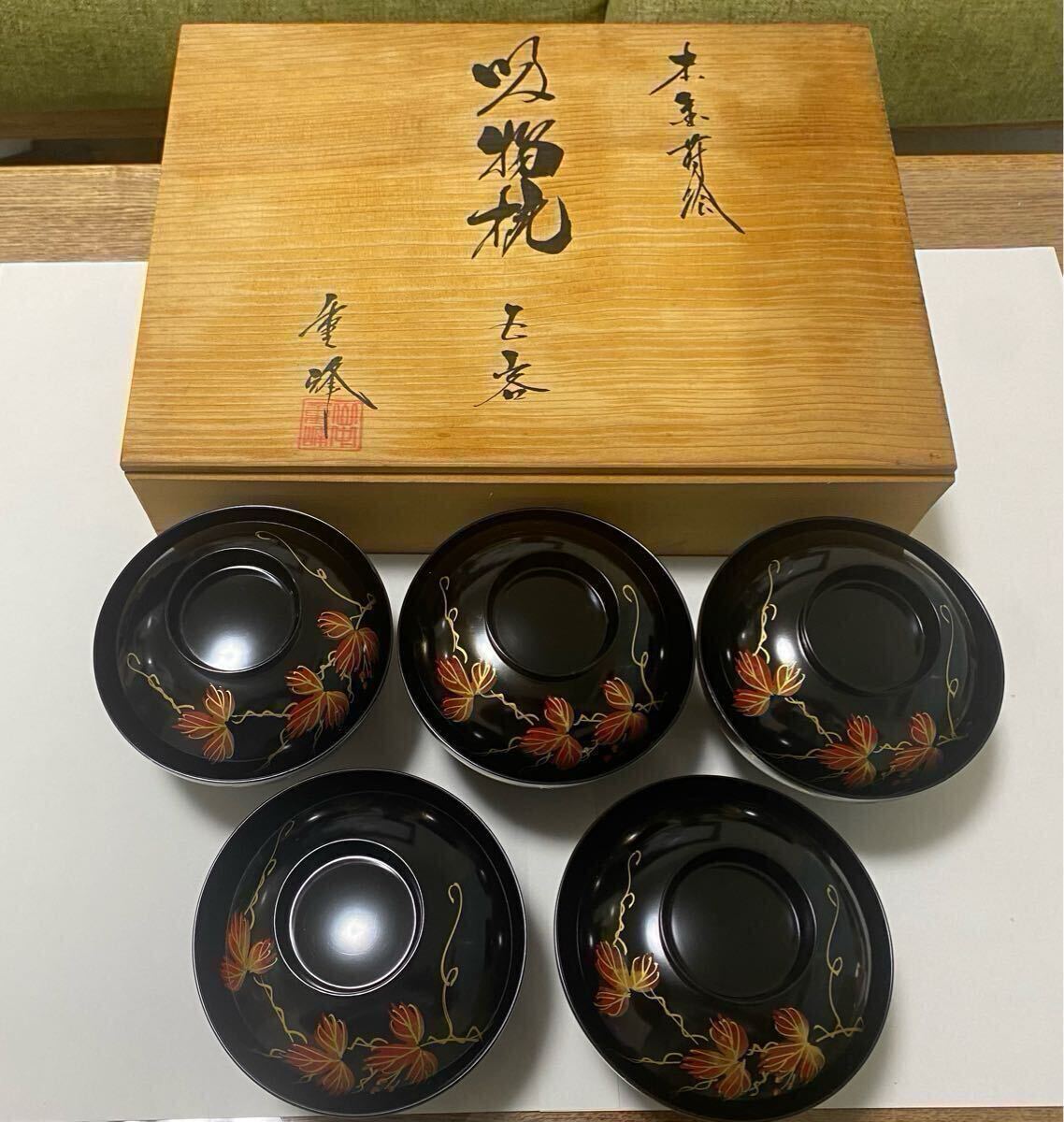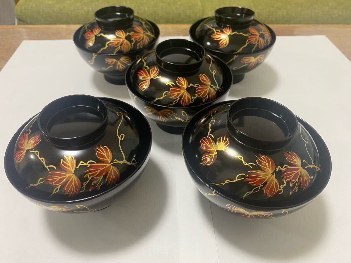 ★ 山中漆器 重峰 蓋付吸物椀 五客 蒔絵 保管品 未使用品。