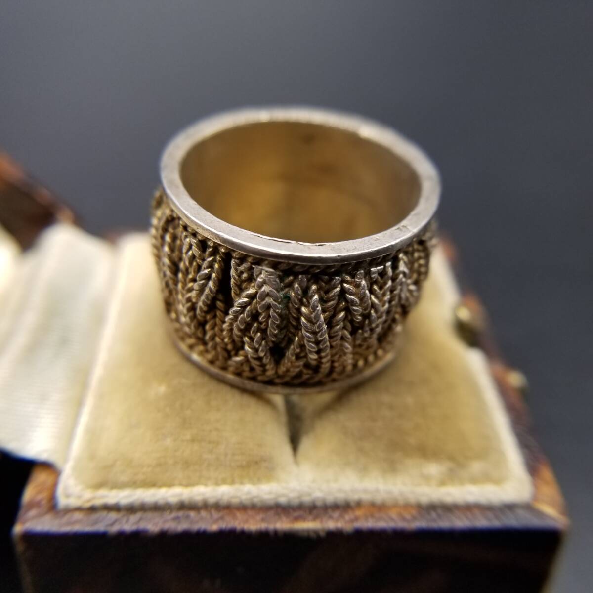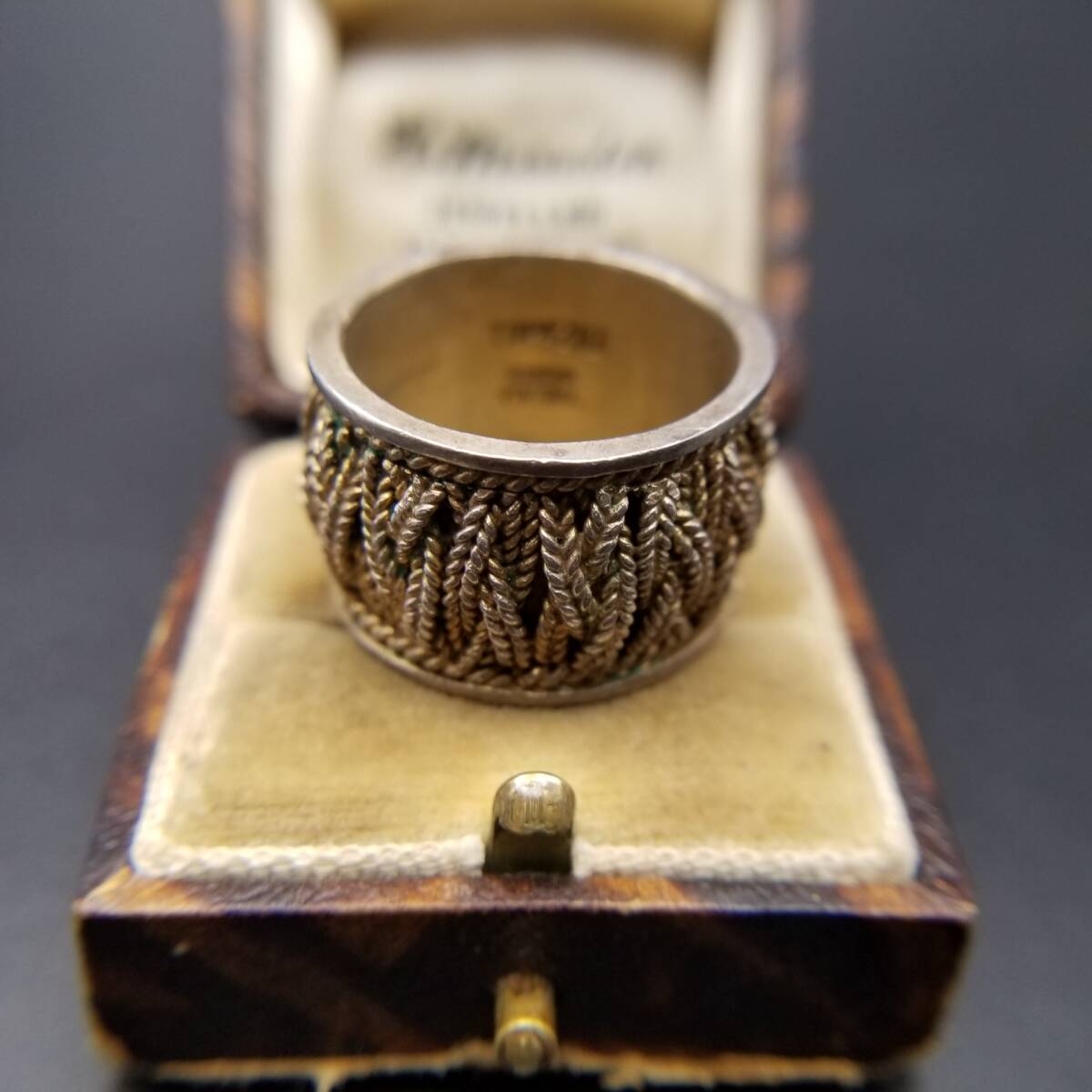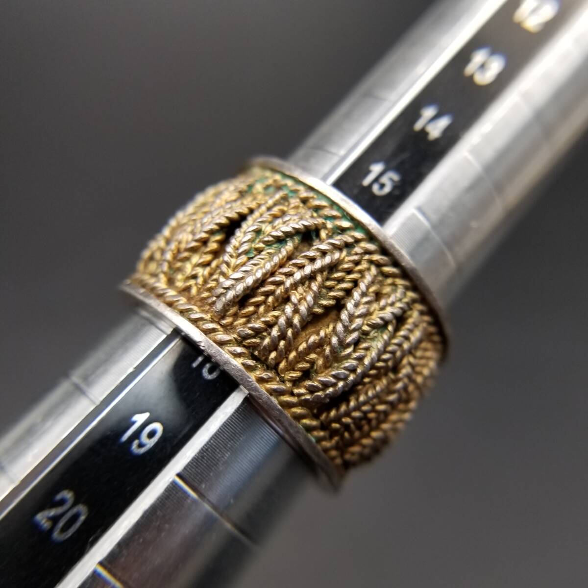 Topazio ポルトガル ヴィンテージ 編み込み ロープ 925 シルバー バンド リング 極幅広 銀 シガーバンド ゴールドトーン 大ぶり 存在感 R15-V