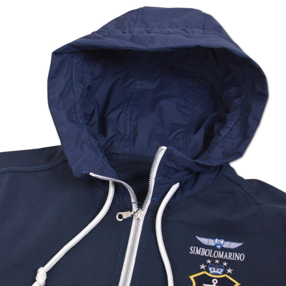 カットソーとナイロンの異素材を組み合わせたパーカーで、胸の刺繍は、階級章とエンブレムをイメージしたアップリケ仕様となっており、腰ポケット部分には左に左舷のイメージでレッド、右に右舷のイメージでグリーンのボタンを付け、内側には内ポケットとして使用可能なセーフティポケットを付けています。