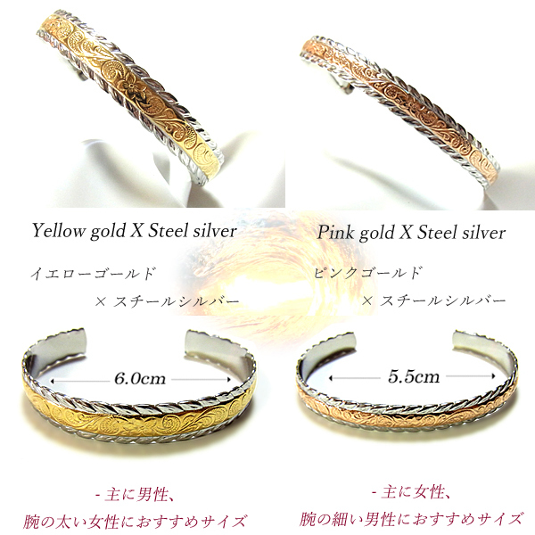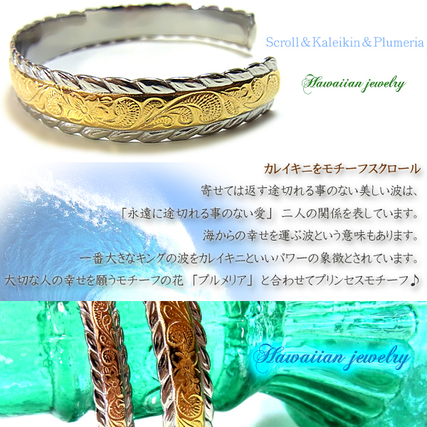 ステンレスバングル シルバーツートン&ゴールド&ピンクゴールドプルメリア&カレイキニ