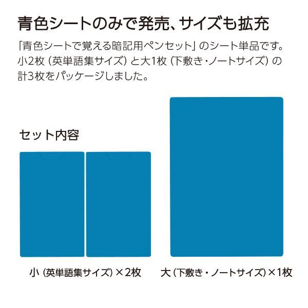 ●3枚入り/シート小(英単語集サイズ)2枚と、ノート1ページ分を丸ごと隠せるシート大(下敷き・ノートサイズ)1枚の計3枚入りなので、複数の参考書で使用したり、学習の仕方に応じて使い分けたりすることができます。