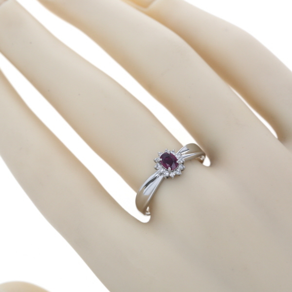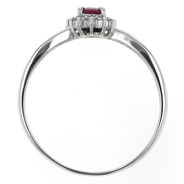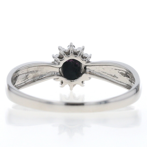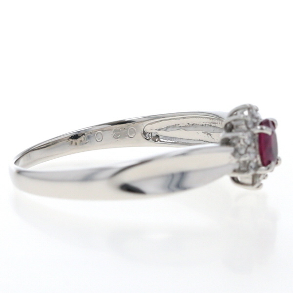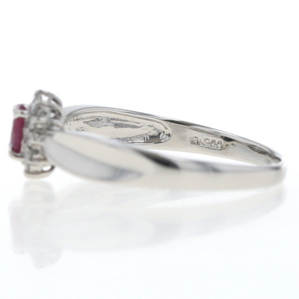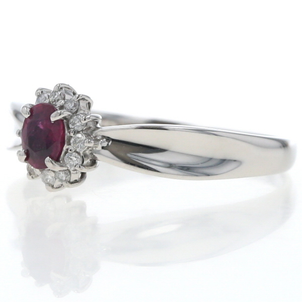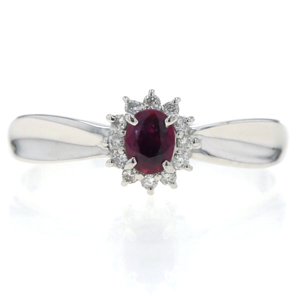 商品紹介 | プラチナ製のルビーとダイヤモンドのリングです。 中央にはオーバルカットのルビー、その周りをダイヤモンドが華やかに取り巻くデザインです。 ルビーの鮮やかな赤色とダイヤモンドの煌めきが、指元を上品かつ華麗に彩ります。 石座の裏側には光穴が設けられ、宝石の輝きを最大限に引き出す工夫がされています。 |