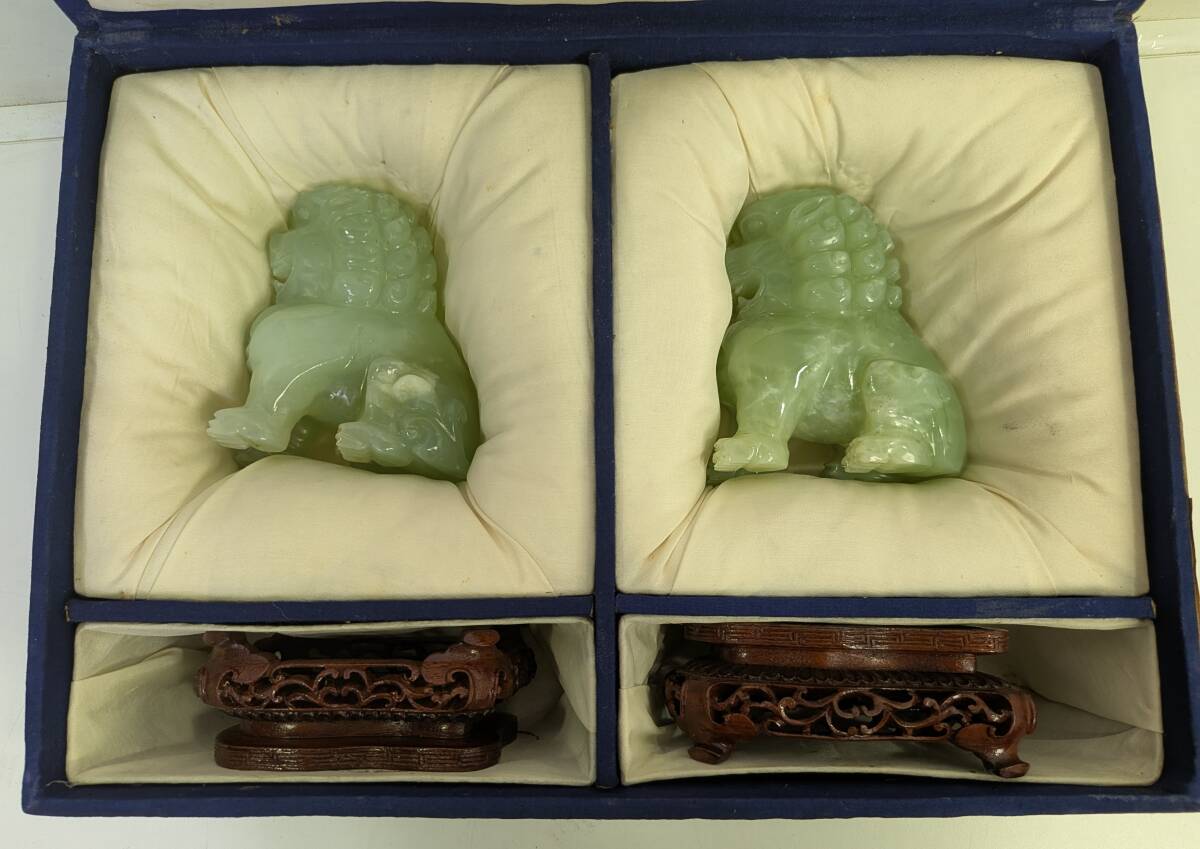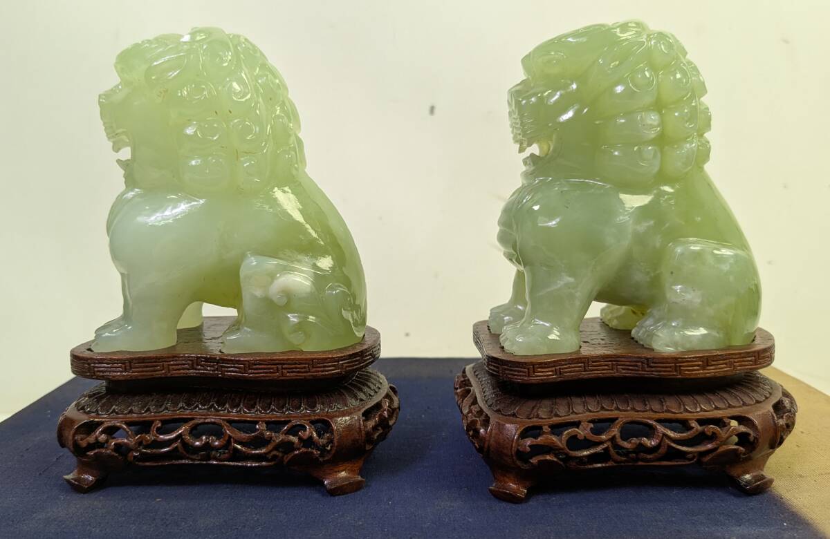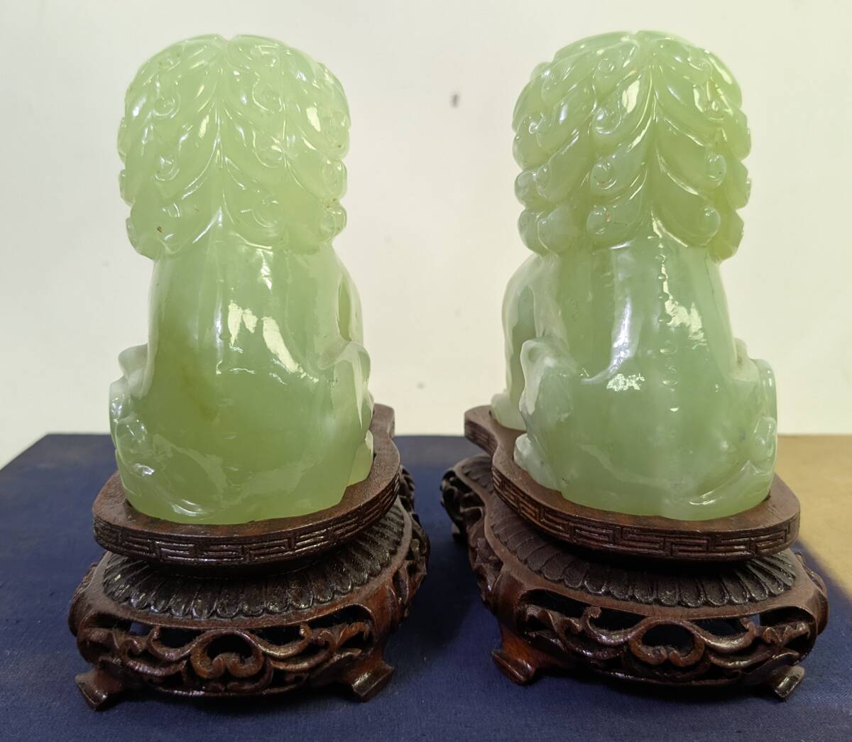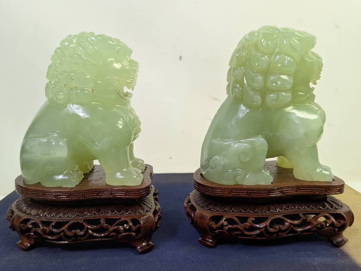 ▽□中国美術 玉石彫刻 獅子 一対 翡翠玉石 唐木台付 1体重量 約600g/高さ 約10.5cm 横 約5.5cm 奥行8.5cm
