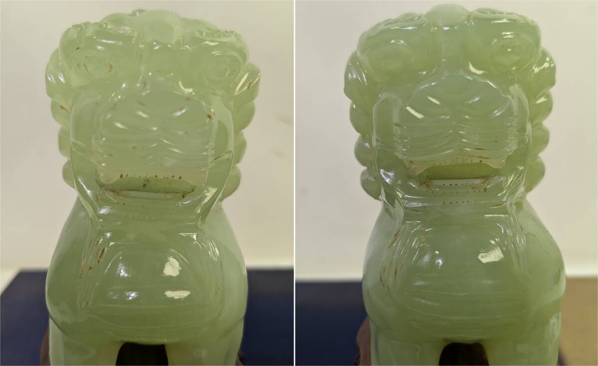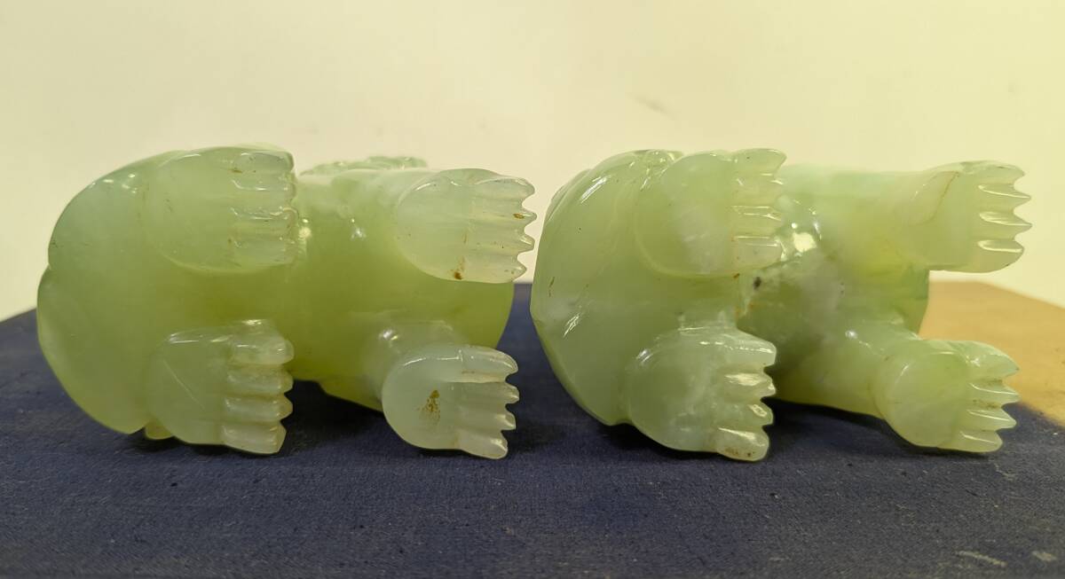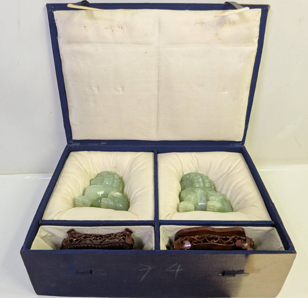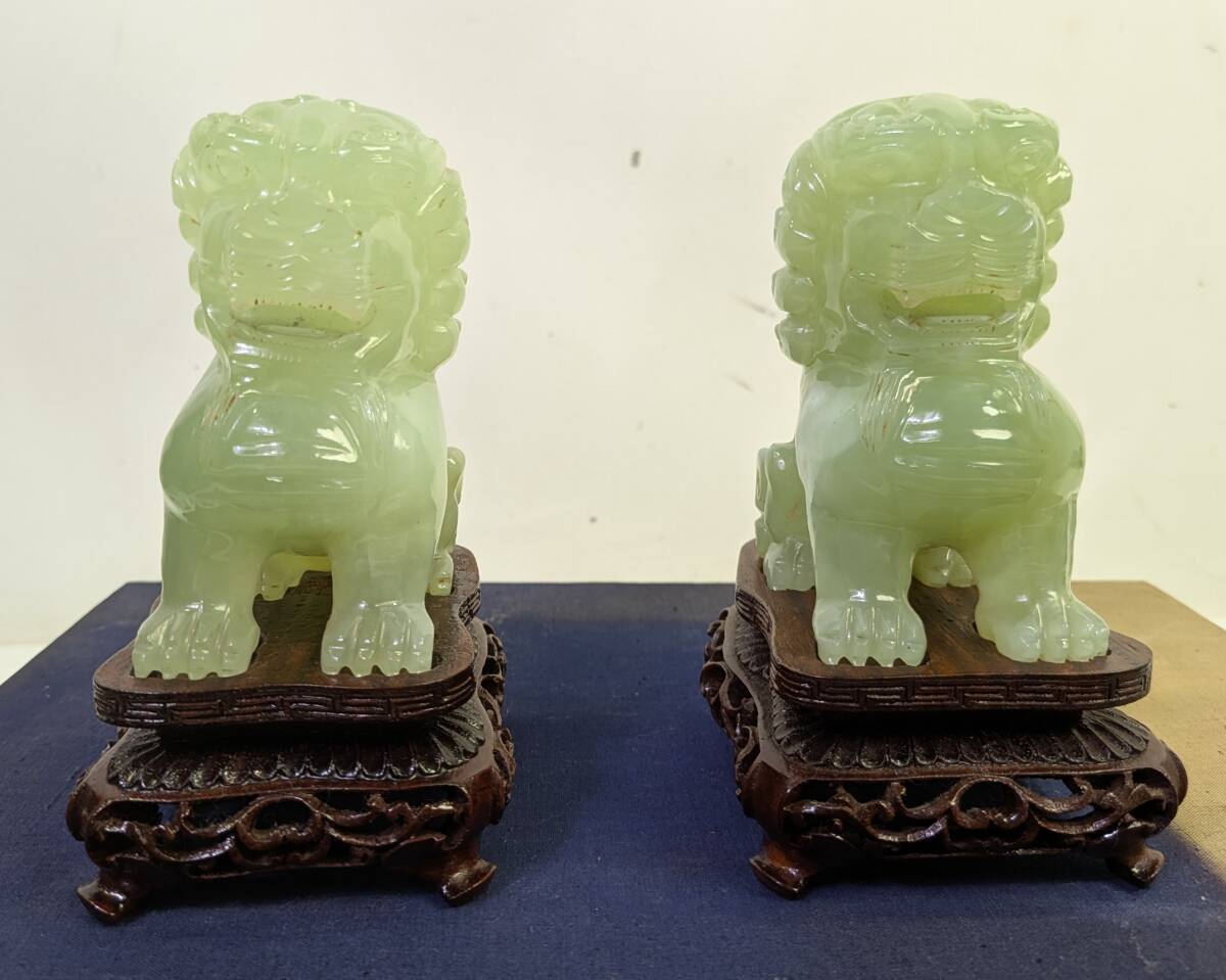 ▽□中国美術 玉石彫刻 獅子 一対 翡翠玉石 唐木台付 1体重量 約600g/高さ 約10.5cm 横 約5.5cm 奥行8.5cm