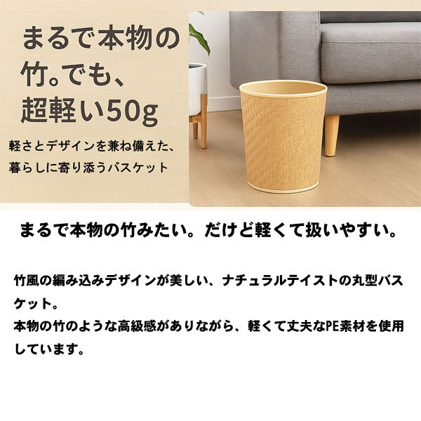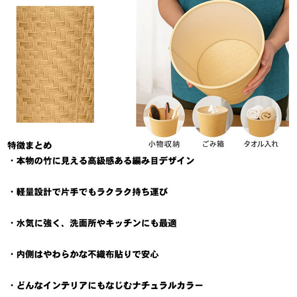 商品説明 | 竹風の編み込みデザインが美しい、ナチュラルテイストの丸型バスケット。 本物の竹のような高級感がありながら、軽くて丈夫なPE素材を使用しています。 023-a 重さはわずか約50gととっても軽量。 お掃除の時や場所を移動するときも片手でラクラクです。 内側には不織布を貼っており、収納物にやさしい仕様です。 お部屋のインテリアになじむ落ち着いた色合いで、どんな空間にも自然にフィット。 リビングや洗面所、子供部屋など、幅広いシーンでご使用いただけます。 |