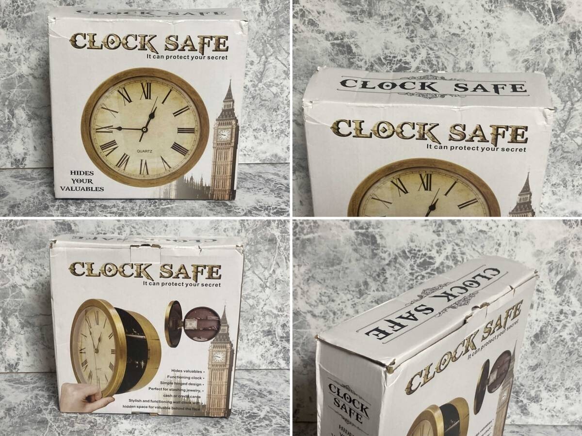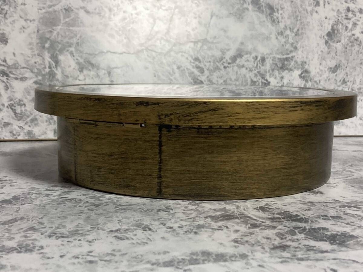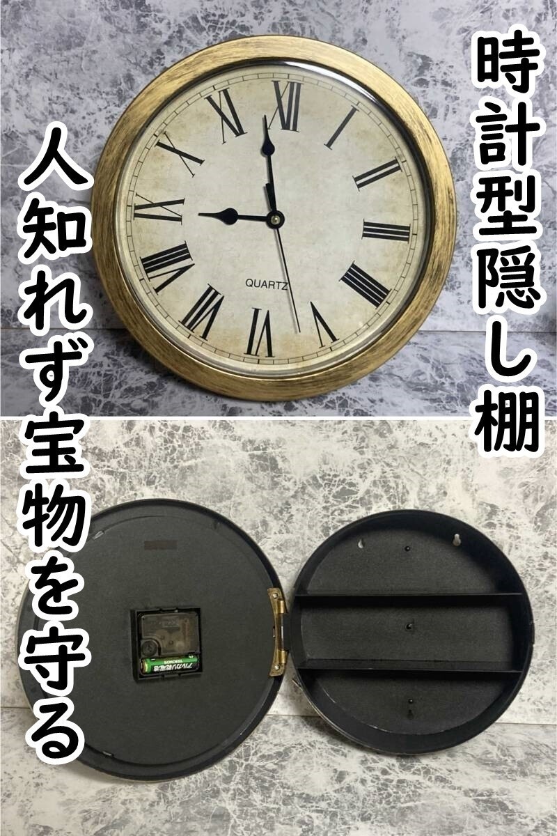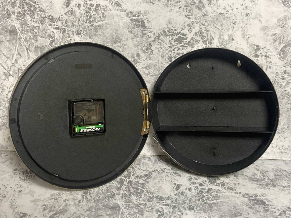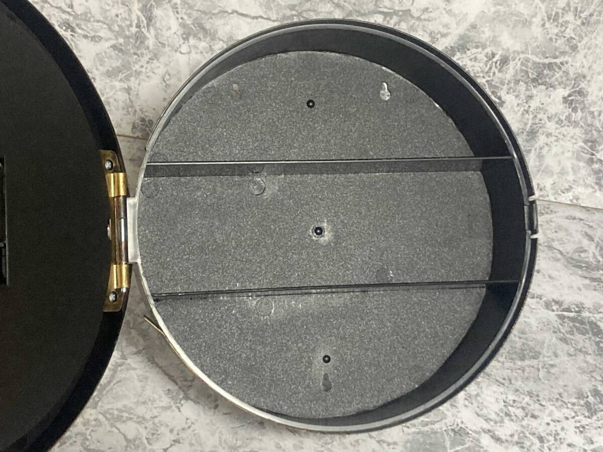 ●おおよそのサイズは、直径25㎝、厚み7㎝、重量450gとなります。文字盤部分が扉のように開き、中の棚にものを収納したり隠したりすることができます。棚は7㎝幅で上中下の三段に区切られています。