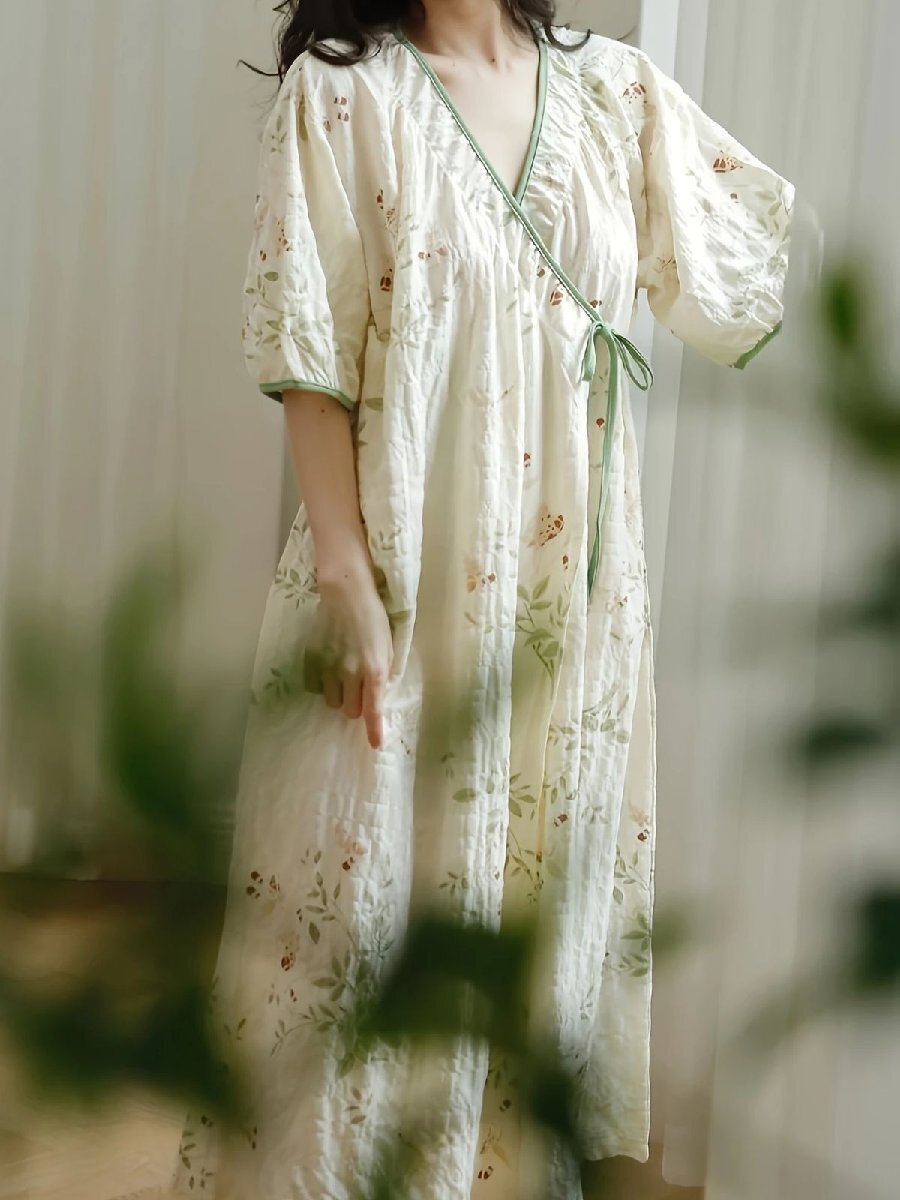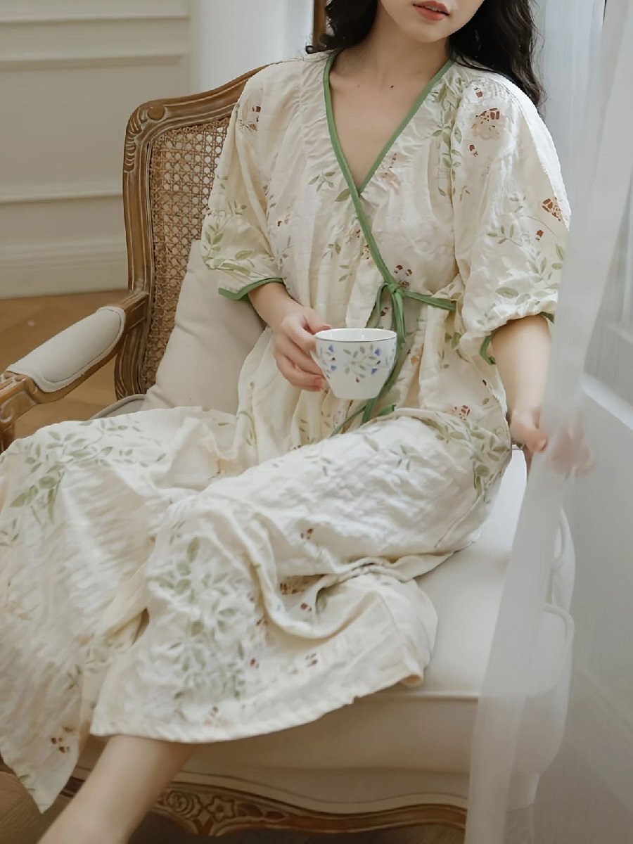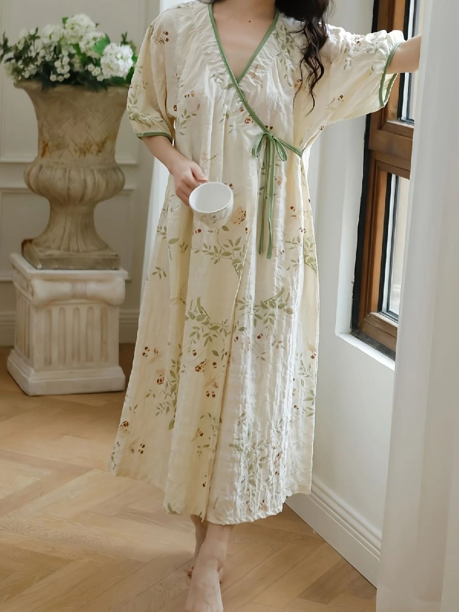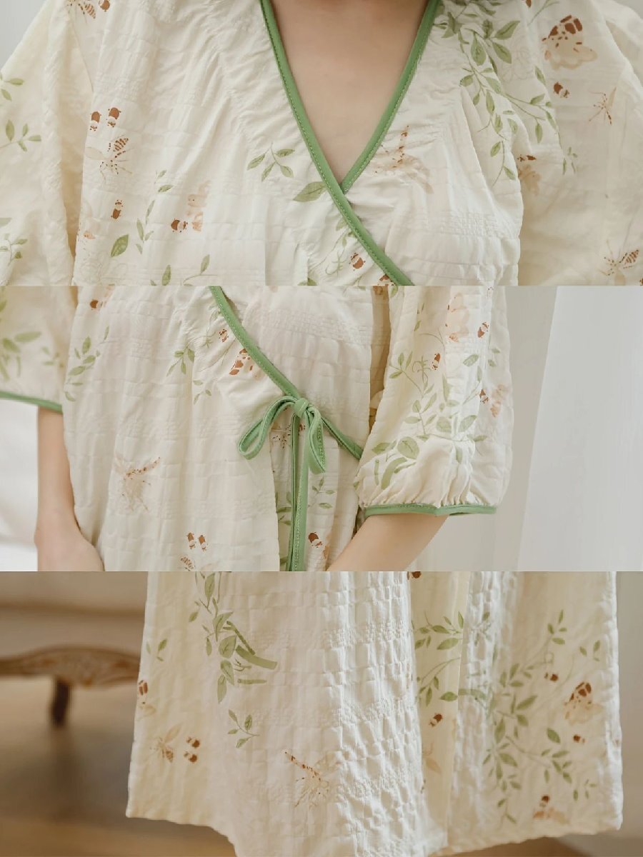 レディース ショートスリーブ タイフロント キモノローブ フローラルパターン Vネック レースアップデ テール【サイズ連絡必須!】