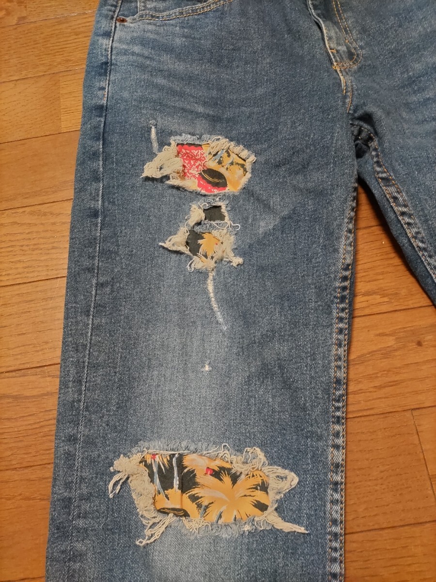 アロハ柄の生地でリペアされており、夏向けのデザインだと思います。