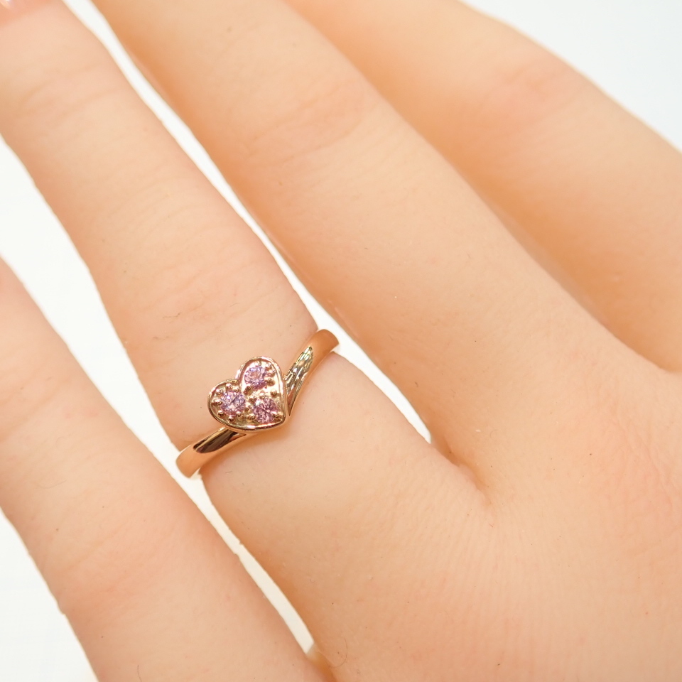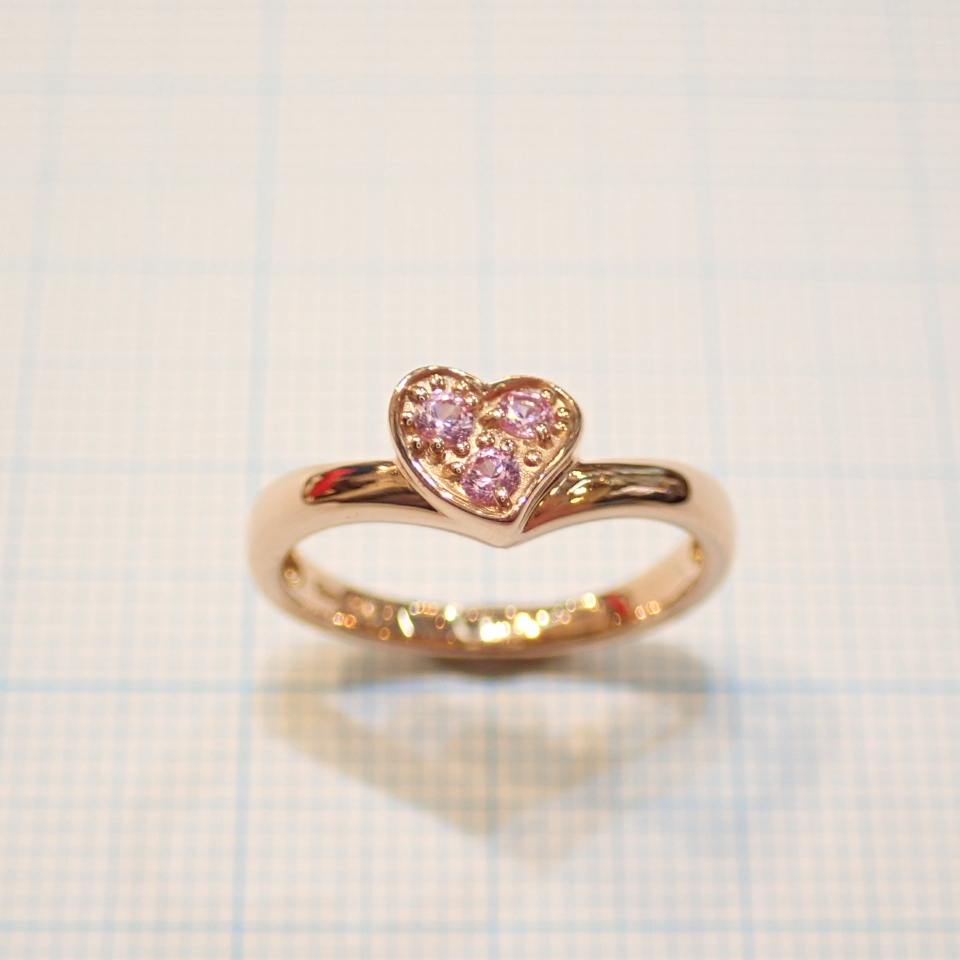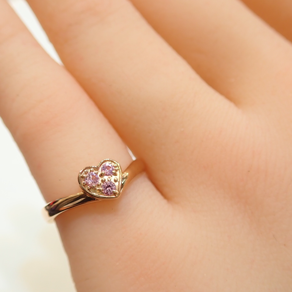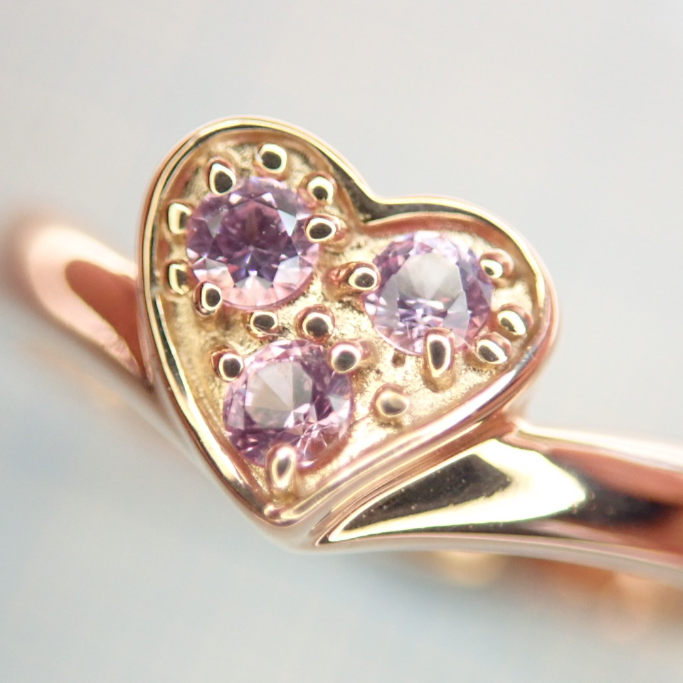 ふんわり優しいピンクゴールドに、キラッと可愛いピンクサファイアを3石(石目は打っておりません)あしらったハートモチーフのリングです。