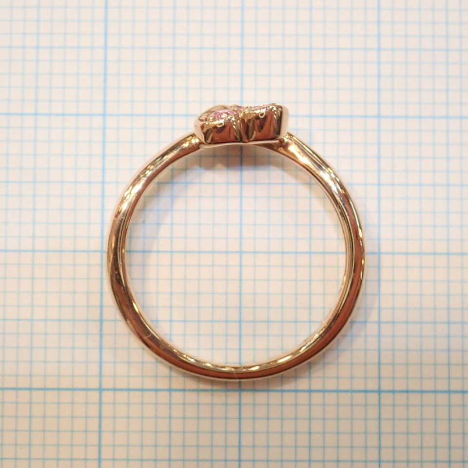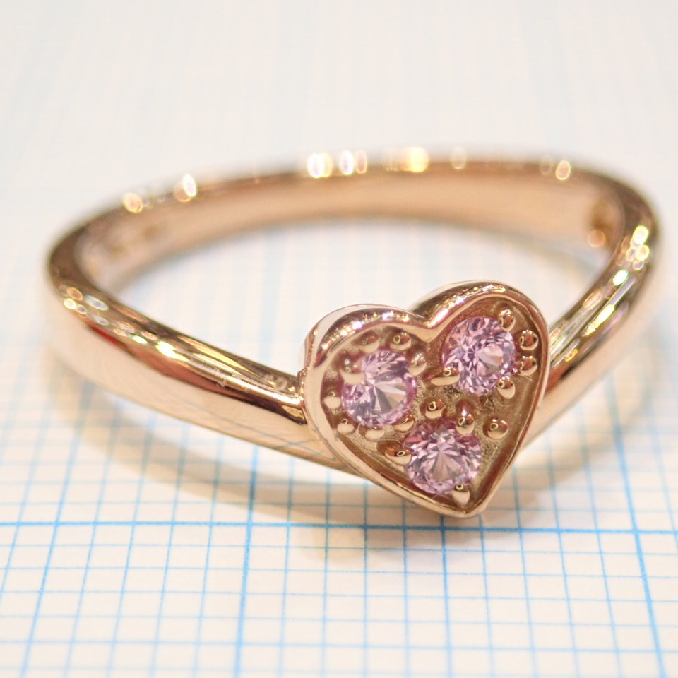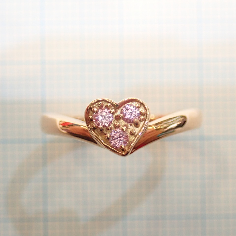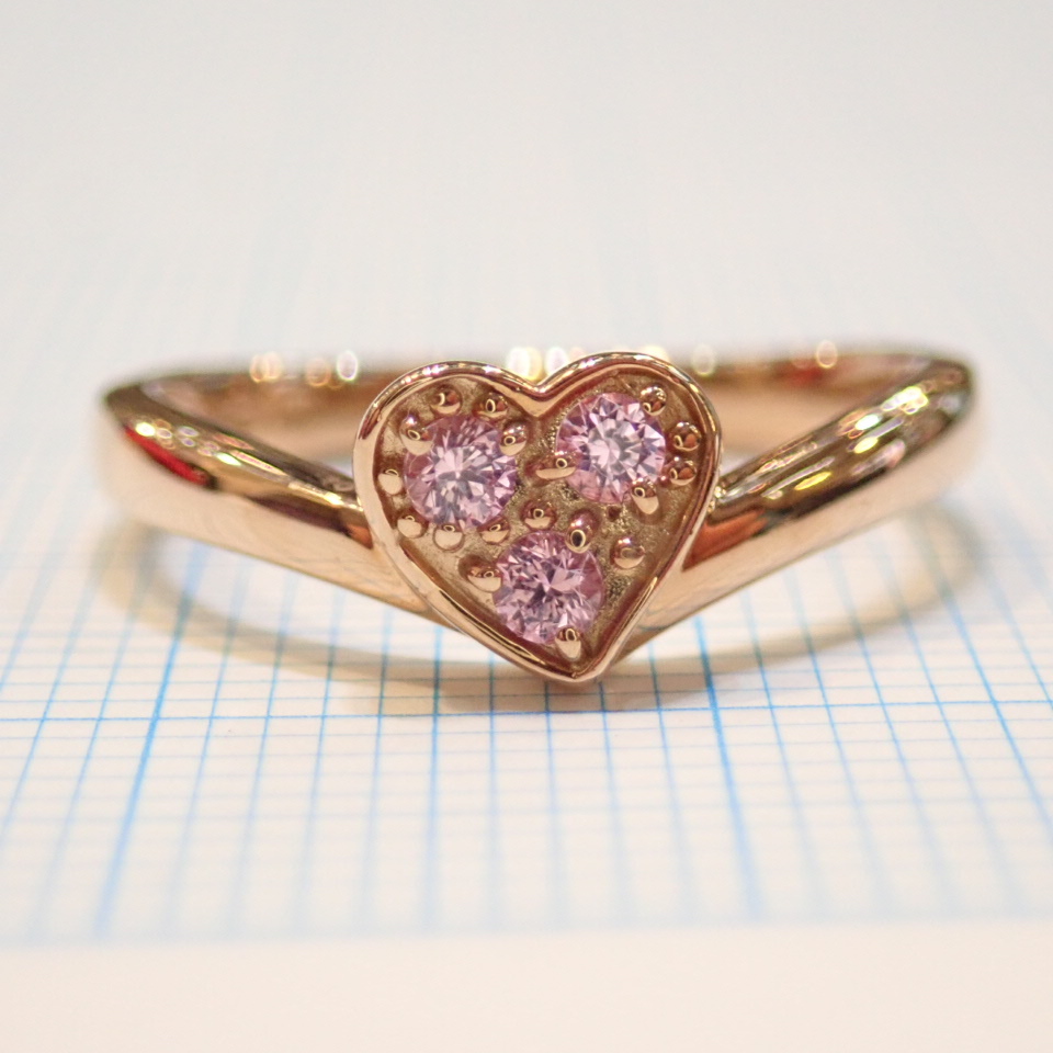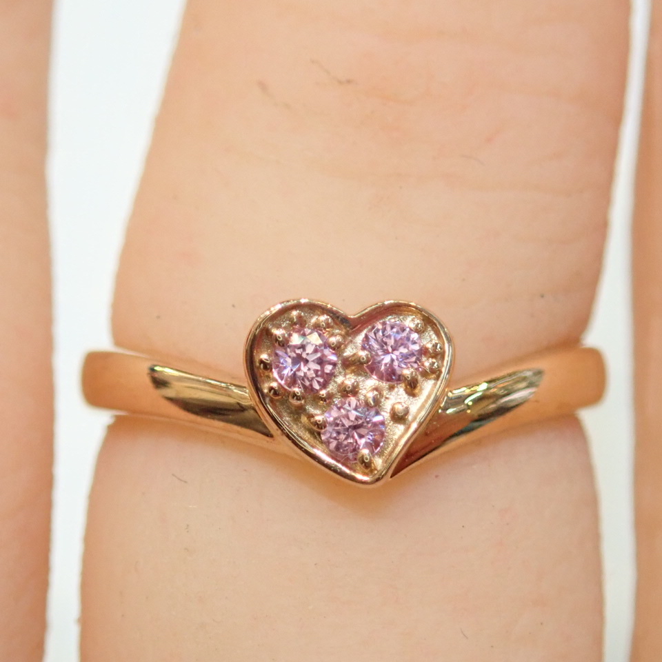 ふんわり優しいピンクゴールドに、キラッと可愛いピンクサファイアを3石(石目は打っておりません)あしらったハートモチーフのリングです。