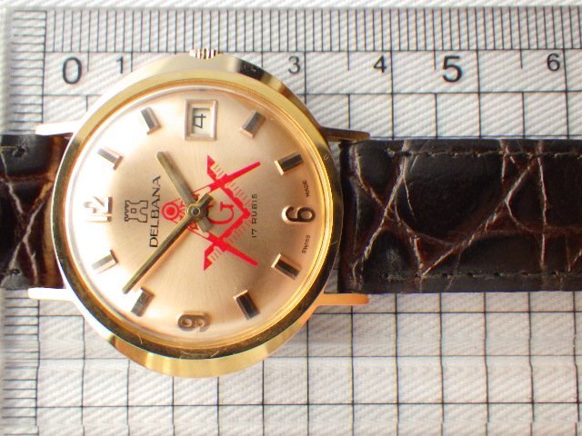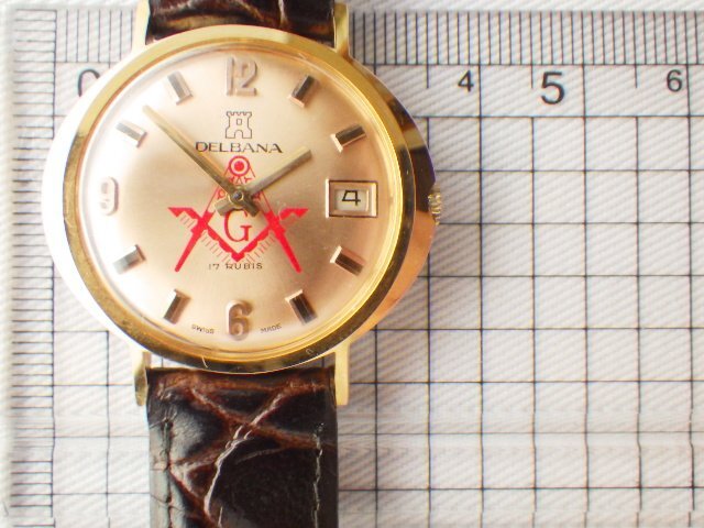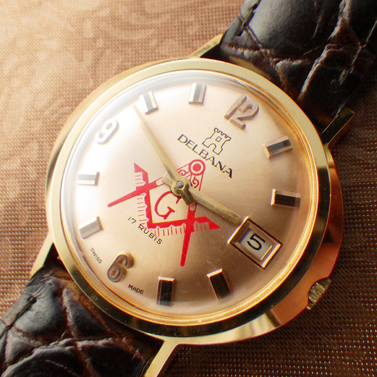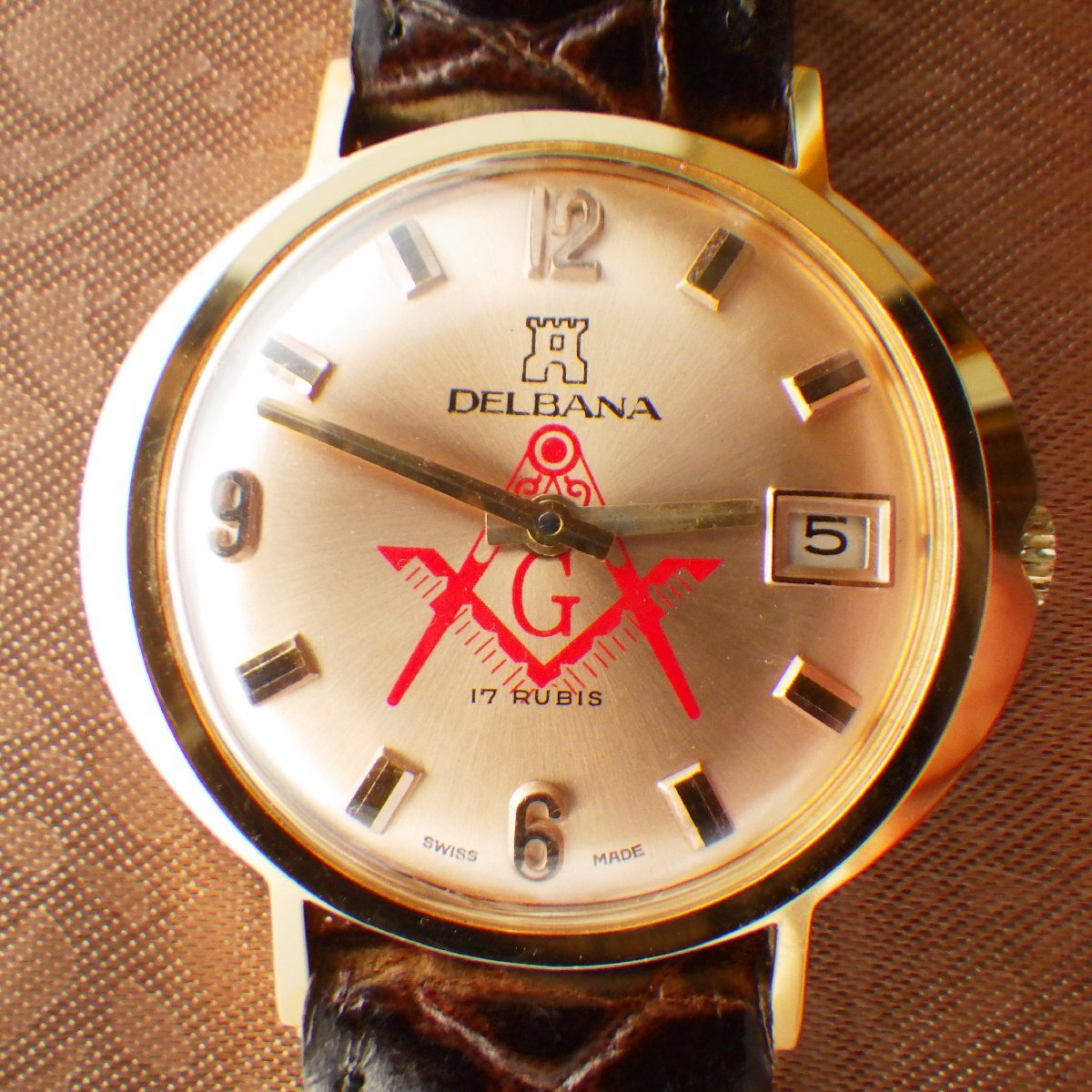 【セール中!!】超貴重★美品★ビンテージ フリーメイソン DELBANA スイス製17石 デイト表示 手巻き腕時計 秘密結社メソニック メーソン