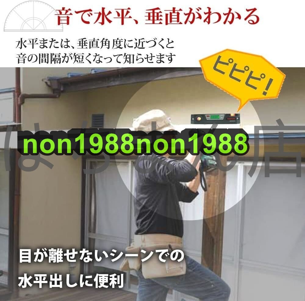 ●商品未使用 状態:新品未使用 【角度が数値でわかる】どの位の傾きがあるのか数値でわかるのはデジタル式だけ。角度(°)、勾配(%)、ピッチ(IN/FT)に対応 【表示を見ずに水平、垂直がわかる】水平、垂直をブザー音でお知らせ。目が離せないシーンでの水平出しに便利です 【マグネットでくっつく】底面に強力な磁石を内蔵。自重ですべり落ちにくい軽量モデル。V字溝付きで鉄骨やパイプにも密着 【見やすい表示】数字が大きく見やすい液晶は、バックライト付きで暗い所でも活躍。逆さまにすると表示も回転する親切設計 【機能充実の本格派】数値が揺れない「ホールドボタン」付き。床の傾きをリセットできる「ゼロ設定ボタン」付き 重量:180g。 ●海外輸入品です。
