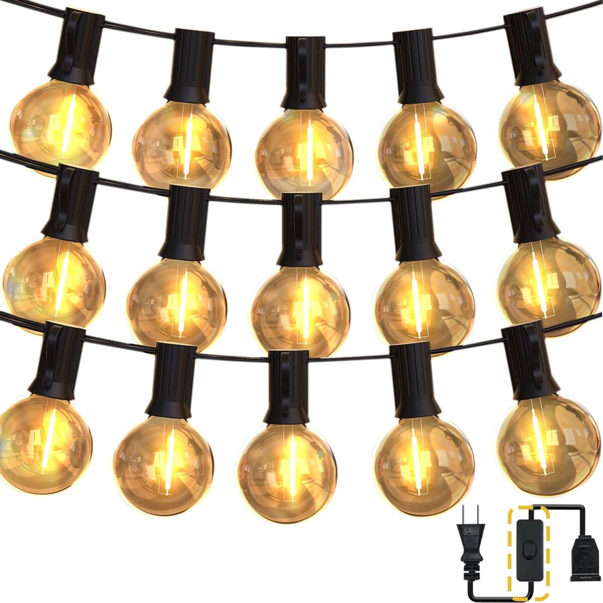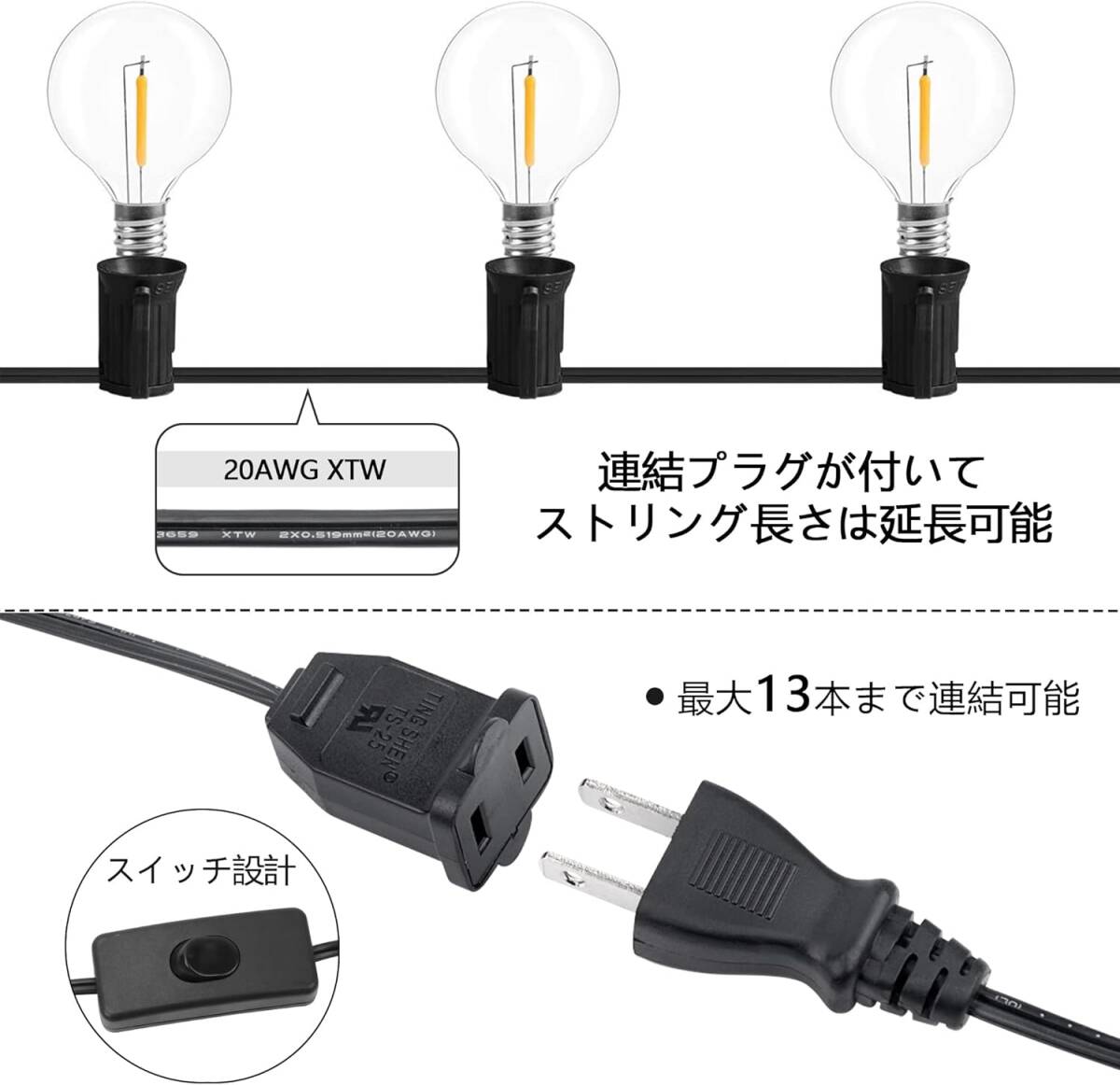LEDストリングライト 防水設計 22M 38個電球 G40 E12口金 USB給電 PC素材 高耐久性 取り外し可能 IP45防水 屋内/屋外照明