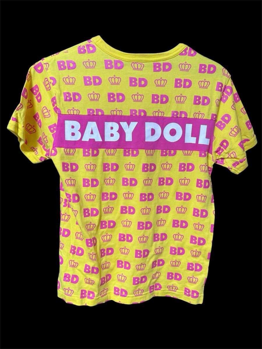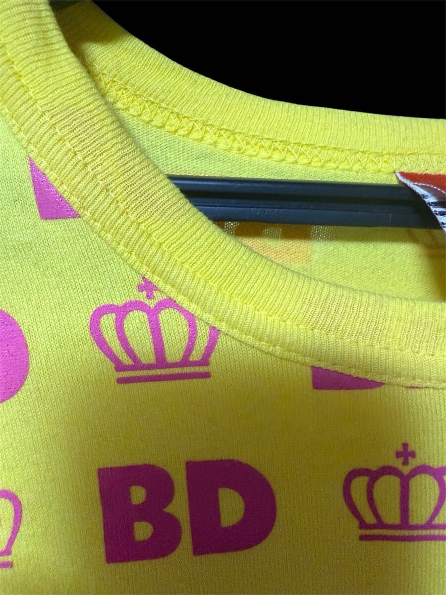 イエローのBDロゴと王冠プリントの半袖Tシャツ、BABY DOLLのユニークなデザイン。