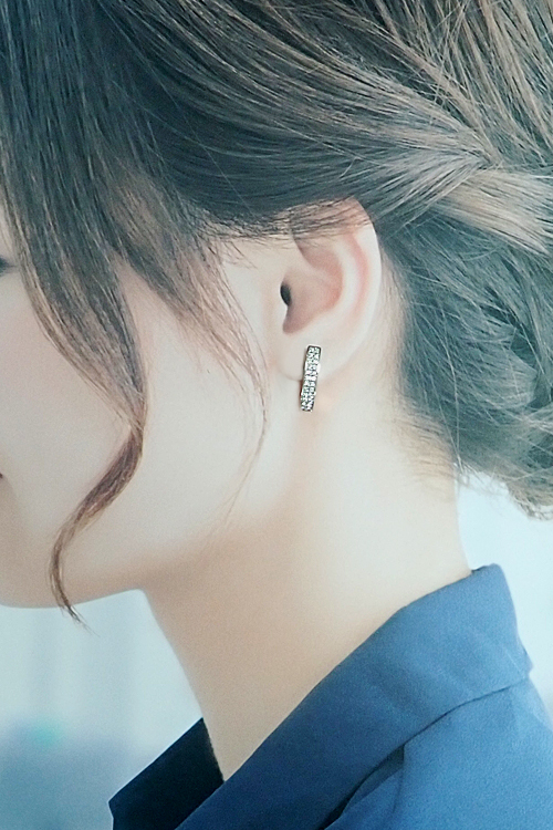 コメント細長いスクエアフォルムがすっきりとした印象の、シンプルなフープピアスです。ライン状にセットされたダイヤモンドの端麗なきらめきがお顔周りを品よく飾ってくれます。