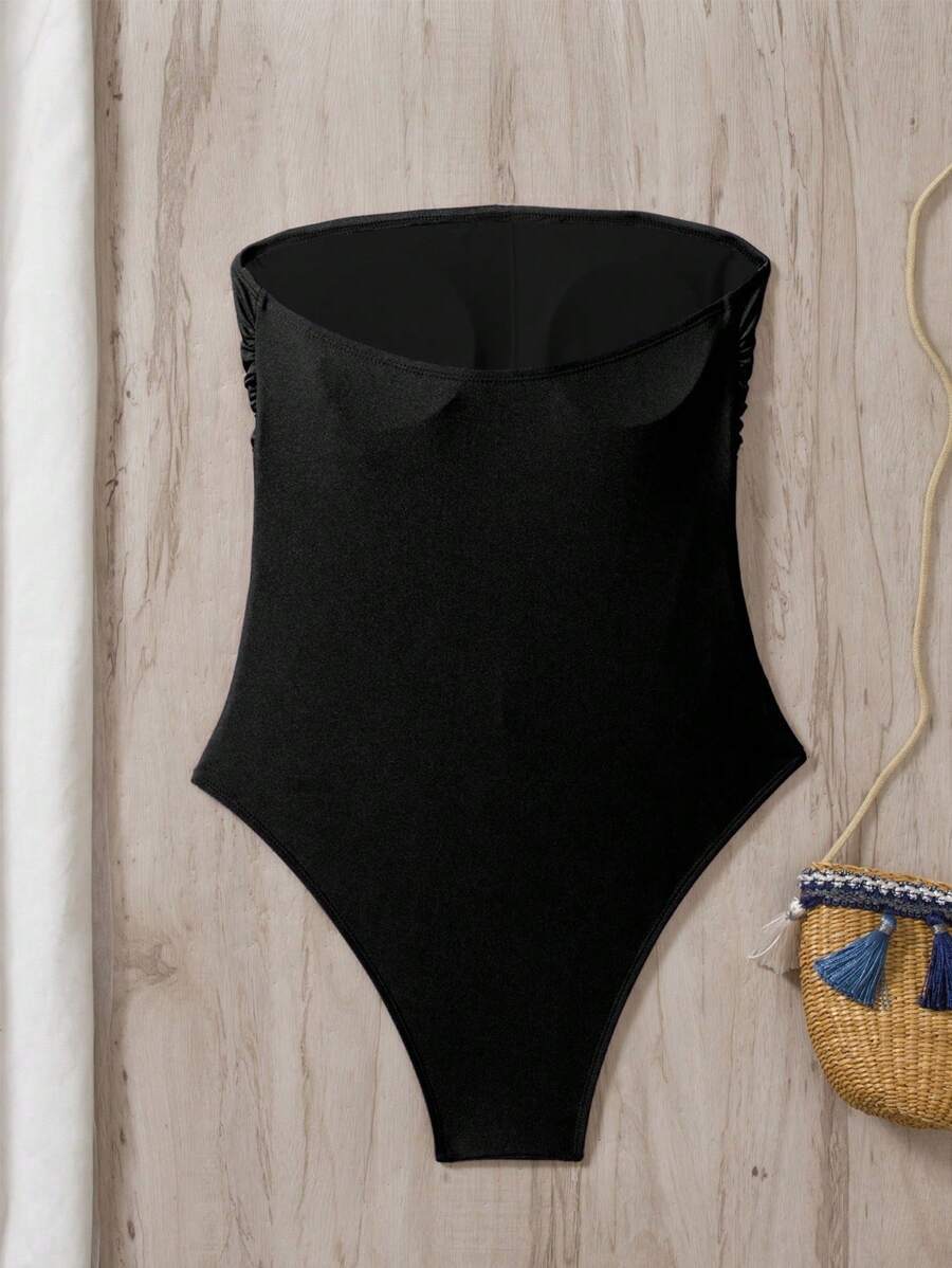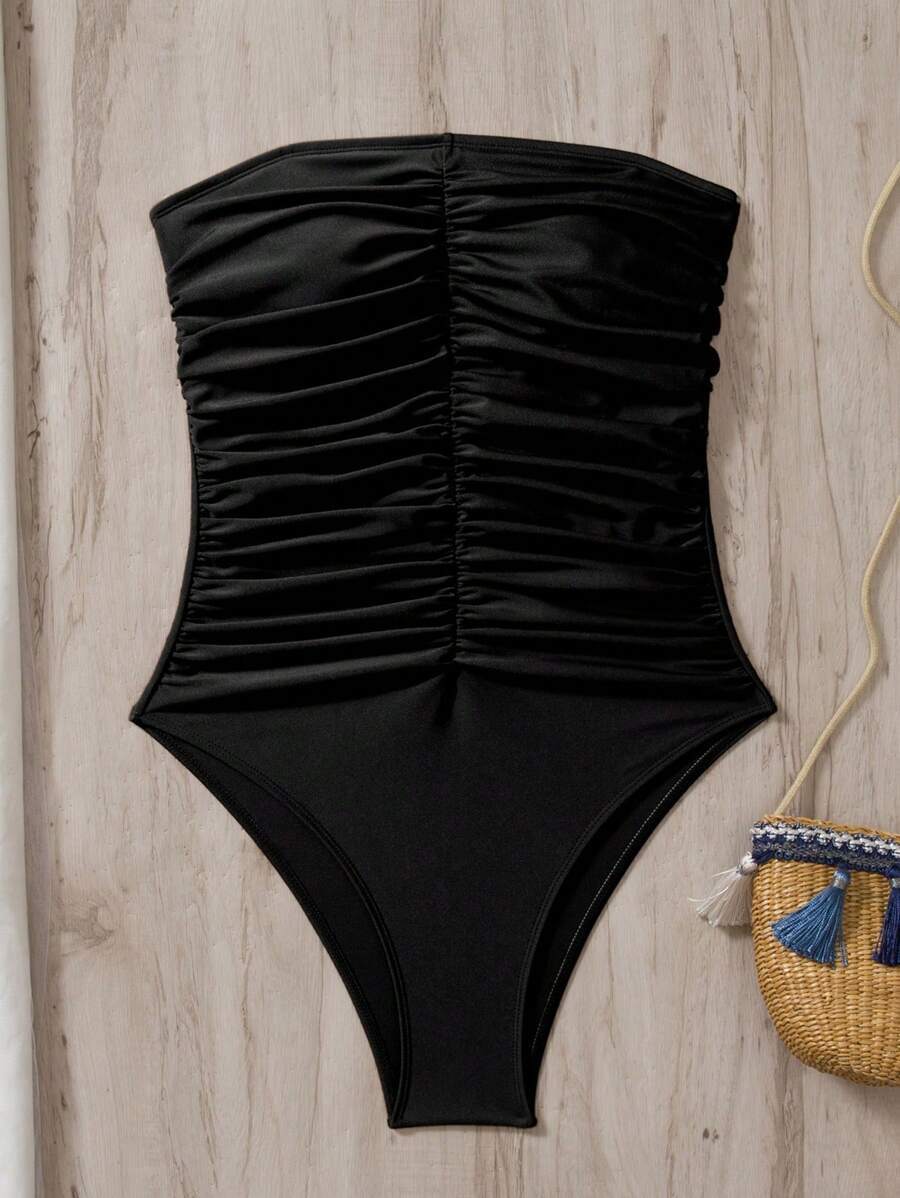 レディース 水着 ワンピース プレーンカラー ひだ加工バンドゥ ワンピース水着、ビーチ&サマーアウトフィット(レディース)