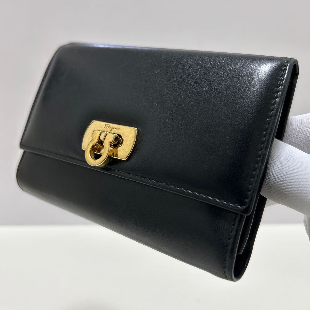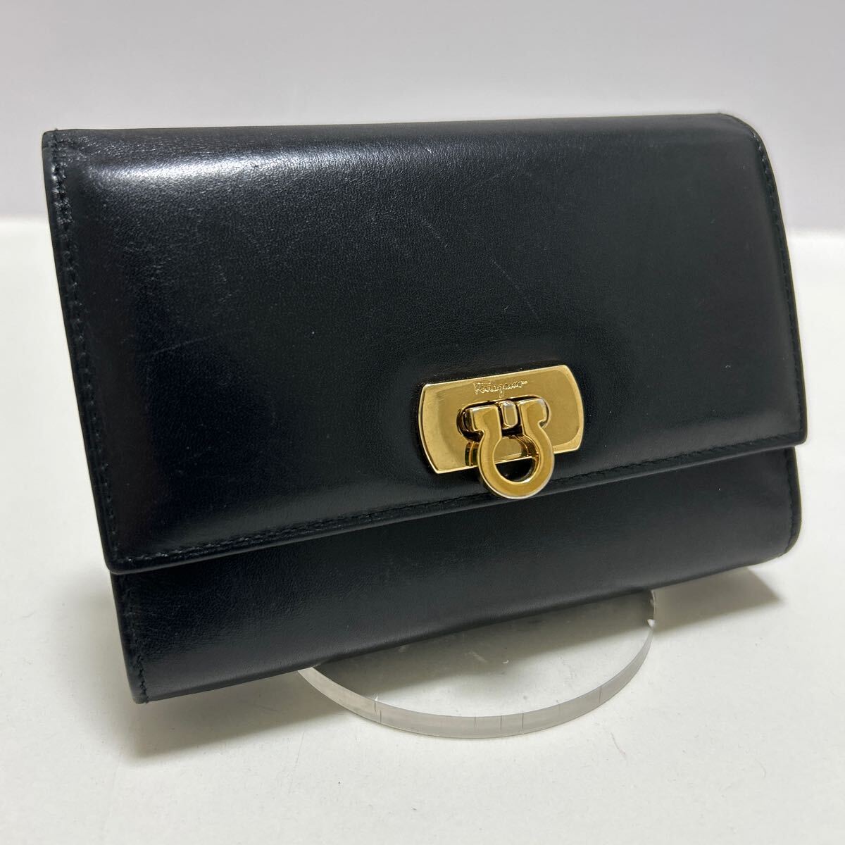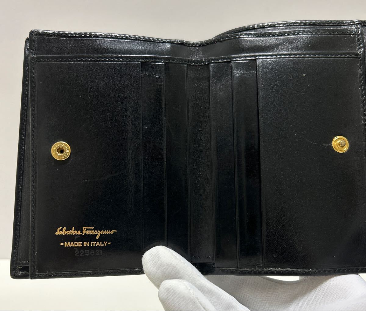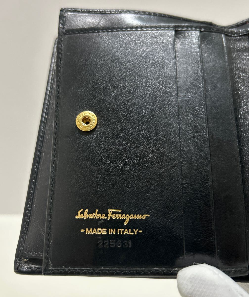 ◆Ferragamo フェラガモ ガンチーニ 三つ折り財布 225631 黒◆ 小銭入れ&定期入れ有 イタリア製 正規品保証 【送料無料】0708