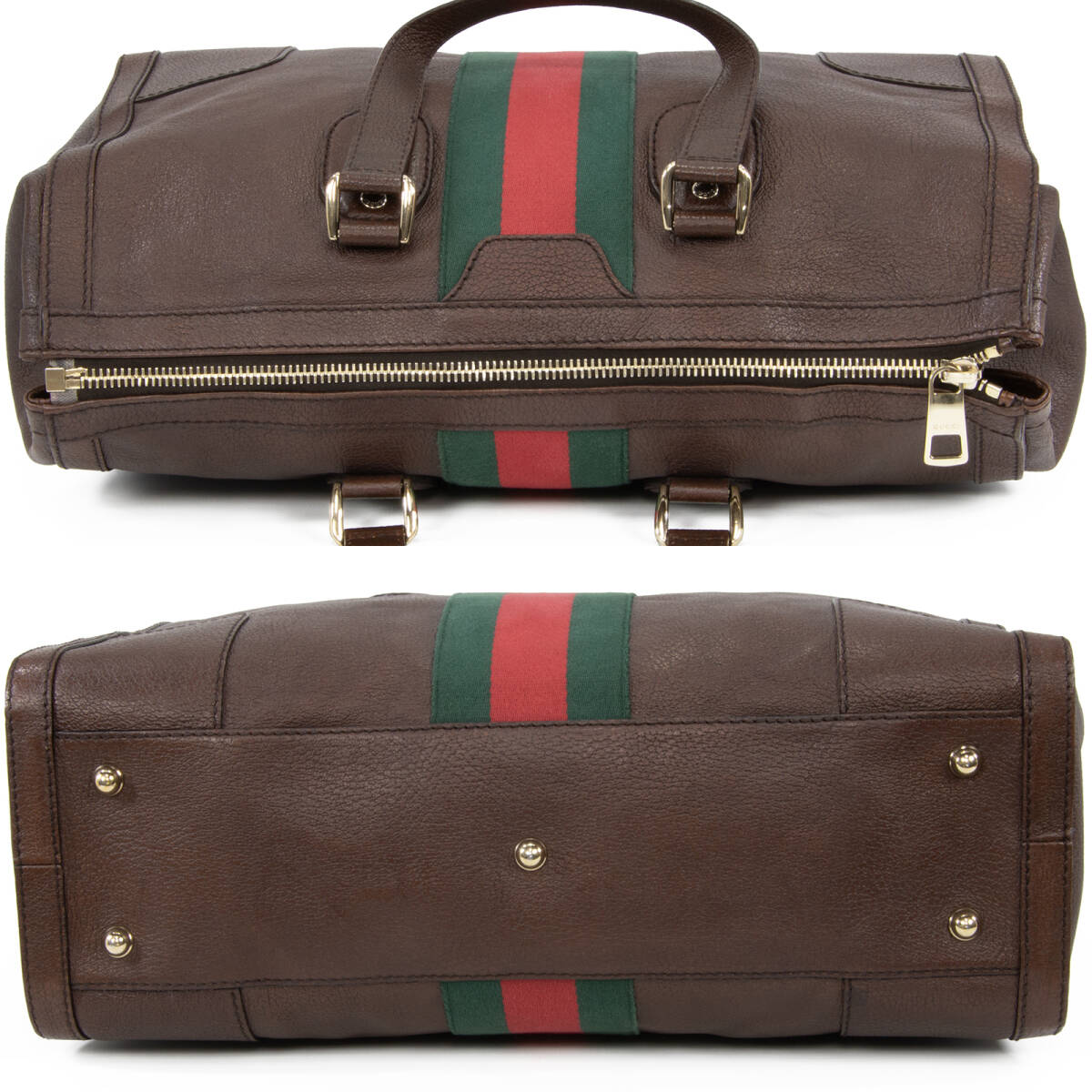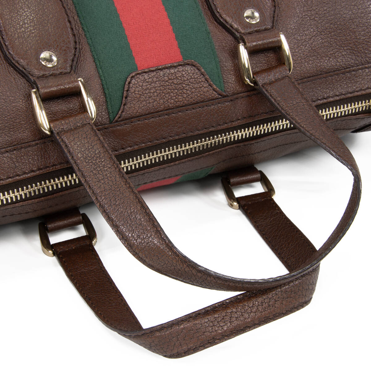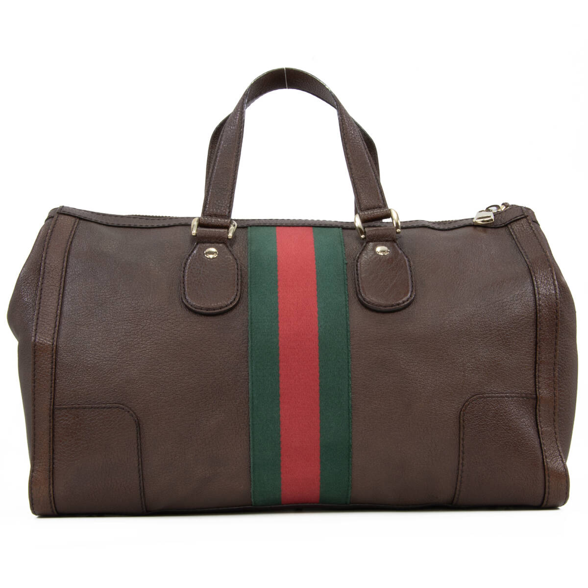 本物 送料無料 グッチ ハンドバッグ ボストンバッグ メンズ レディース シェリーライン 焦げ茶色 旅行 大きめ ロゴ 赤緑 革 鞄 バック F261