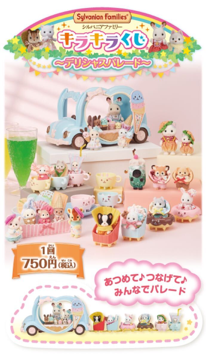 今回はデリシャスパレードがテーマ。アイスクリームやハンバーガーをモチーフにしたかわいいコスチュームのなかまたちがいっぱい!A賞のアイスクリームワゴンとE賞・F賞のパレードカーはつなげられるのでたくさんつなげてパレードしよう!