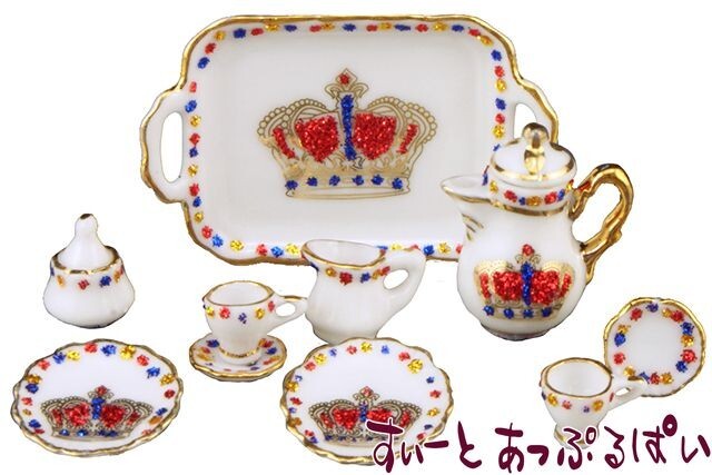 ロイター新柄のクラウンです。なんか、キラキラしてますよ・・!2014年新商品です!アクリルケース入りです。アクリルケースのサイズ:80x55xH45mm。※ポットとウォーマー、カップとソーサー、シュガーポットの蓋は接着されています。お皿の直径20mm、トレイのサイズ:42x32mm(取っ手含まず)