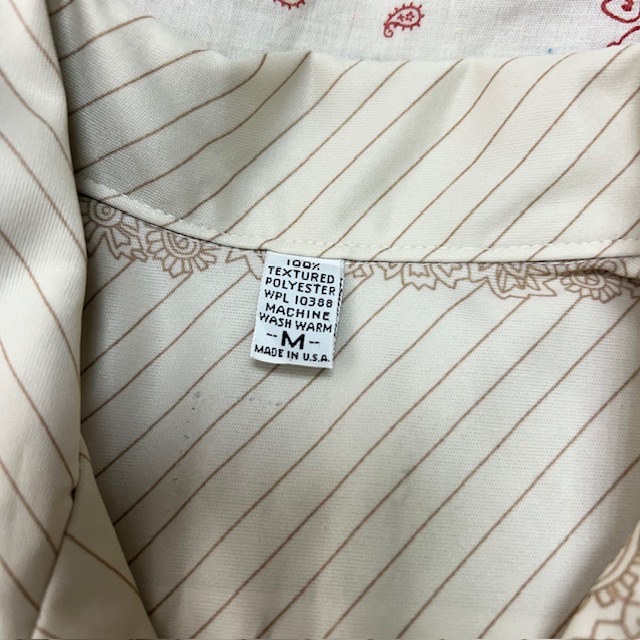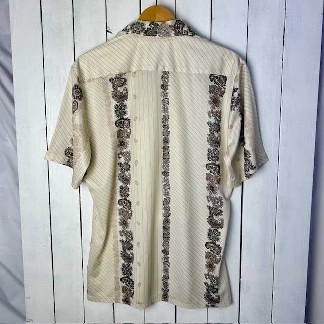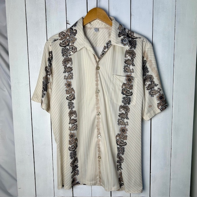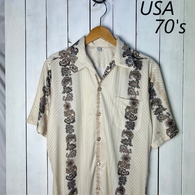 sh●938 USA古着 70s USA製 ペイズリー柄ライン 開襟ポリシャツ M  薄ベージュ オールド ヴィンテージ アメリカ古着 レトロ 半袖 春夏 薄手