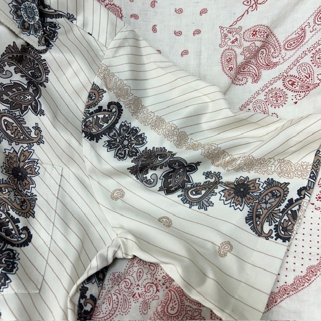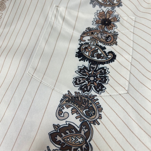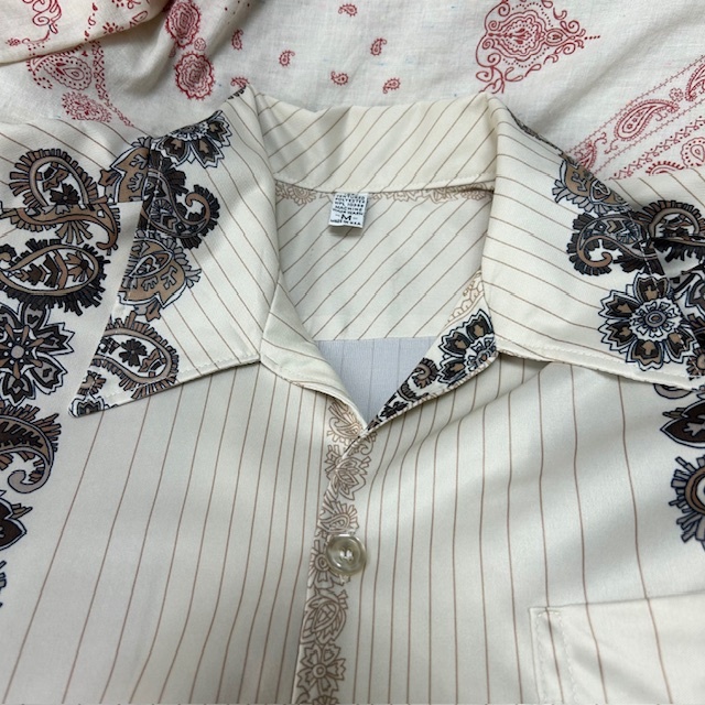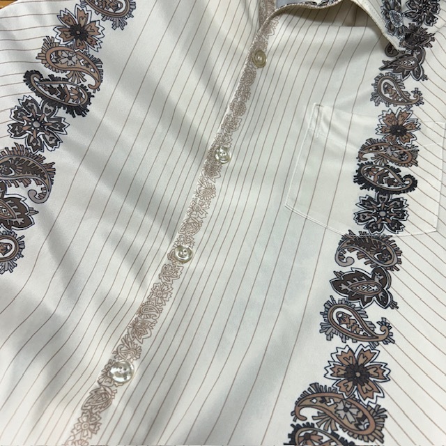 ●商品説明・・・アメリカ古着になります。70年代頃のオールド・ヴィンテージの薄いピンストライプにペイズリー柄がラインのように入ったレトロでかっこいいのオープンカラー(開襟)半袖シャツ(ポリシャツ・70sシャツ)です。made in USA (アメリカ製)で 素材はポリエステルで、さらっとした薄手で涼しげな生地感です。色は薄いベージュのような感じです。USA M表記で、70s頃の物ですのでそのままM程度のサイズ感かと思います。