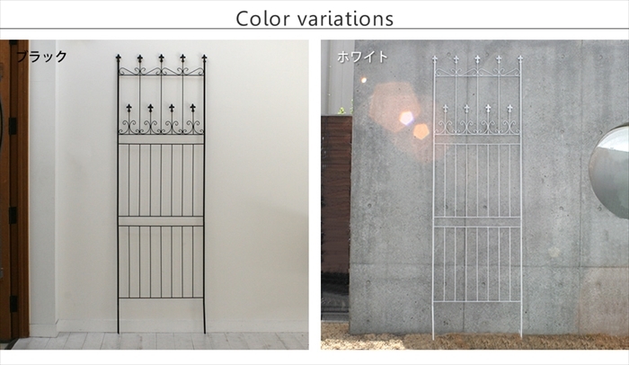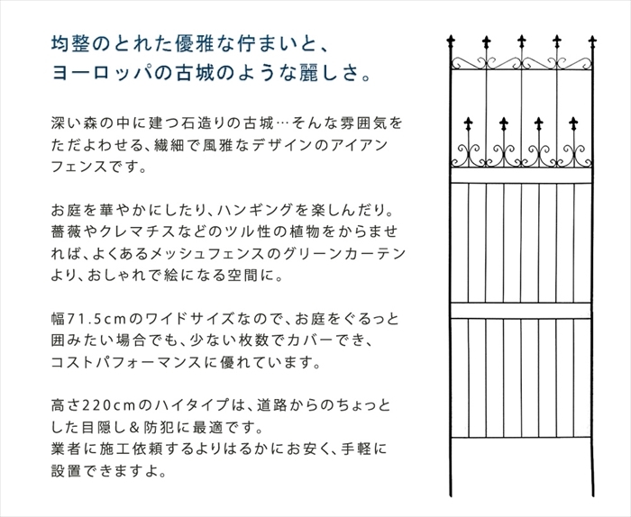 | 均整のとれた優雅な佇まいと、ヨーロッパの古城のような麗しさ。 深い森の中に建つ石造りの古城…そんな雰囲気をただよわせる、繊細で風雅なデザインのアイアンフェンスです。 お庭を華やかにしたり、ハンギングを楽しんだり。 薔薇やクレマチスなどのツル性の植物をからませれば、よくあるメッシュフェンスのグリーンカーテンより、おしゃれで絵になる空間に。 幅71.5cmのワイドサイズなので、お庭をぐるっと囲みたい場合でも、少ない枚数でカバーでき、コストパフォーマンスに優れています。 高さ220cmのハイタイプは、道路からのちょっとした目隠し&防犯に最適です。 業者に施工依頼するよりはるかにお安く、手軽に設置できますよ。 |
