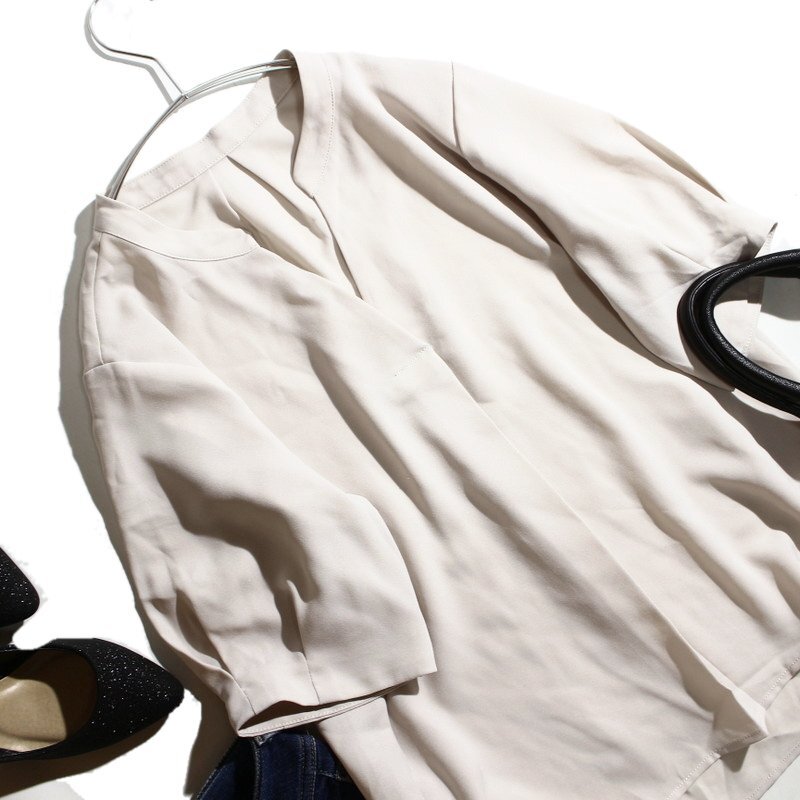 美品 オペ―ク ドットクリップ OPAQUE.CLIP 株) ワールド 夏 透け ジャージ―シフォン 半袖 カットソー ブラウス M ベージュ オフィス 通勤