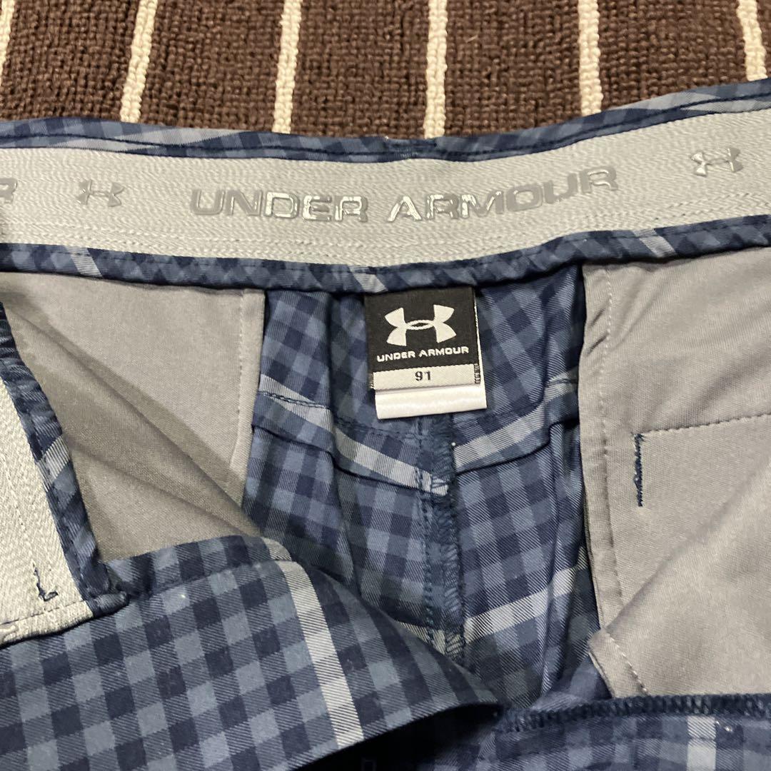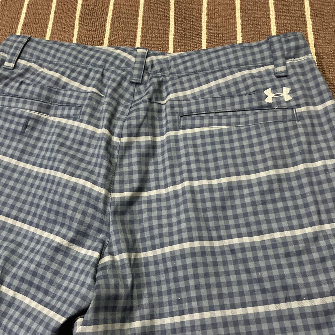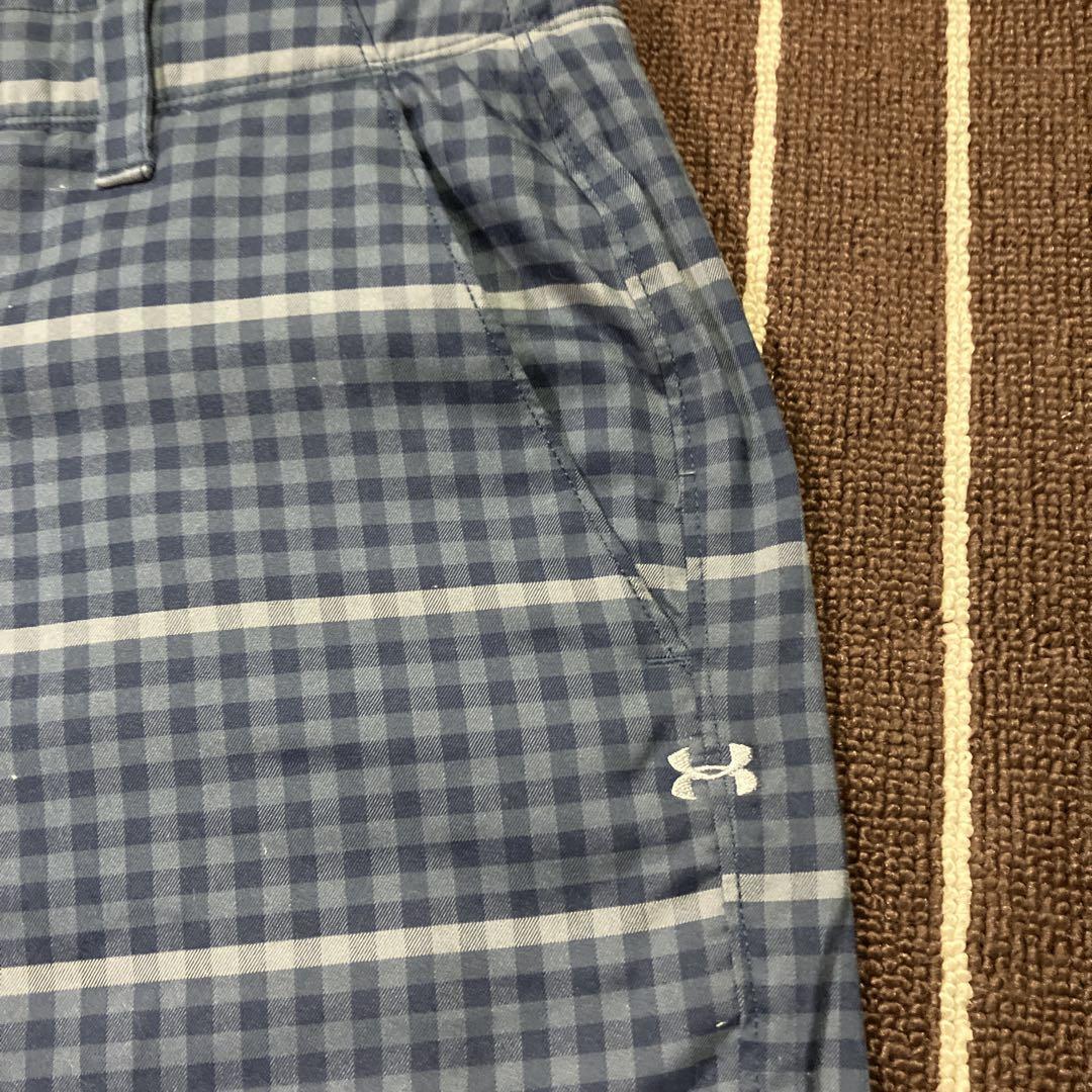 ネイビーのチェック柄のショートパンツ、UNDER ARMOUR製。 -