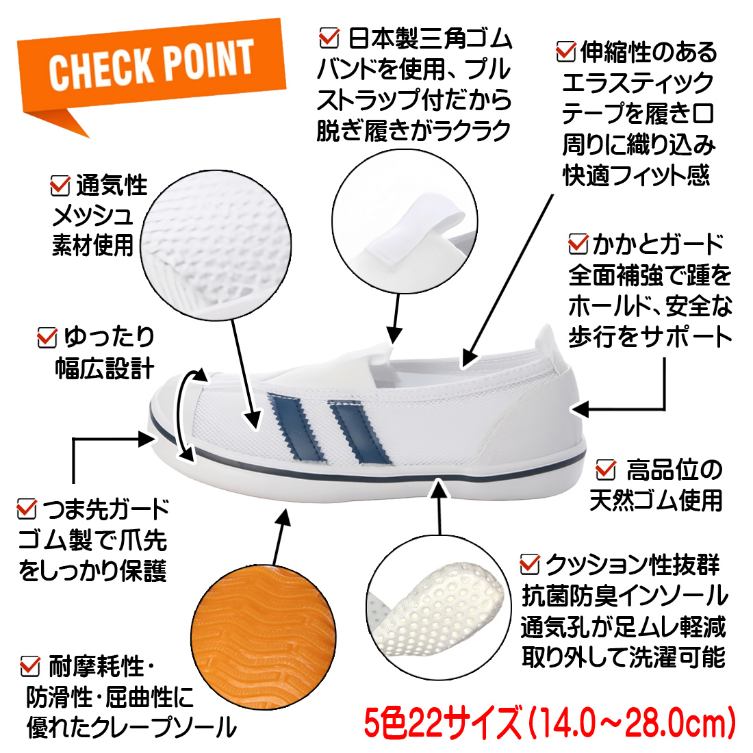 5色・22サイズのバリエーションを豊富に用意しており、子供から大人まで対応。通園・通学・通院・研修での使用はもちろん、リハビリ・介護など、幅広い場面で活躍する一足です。
