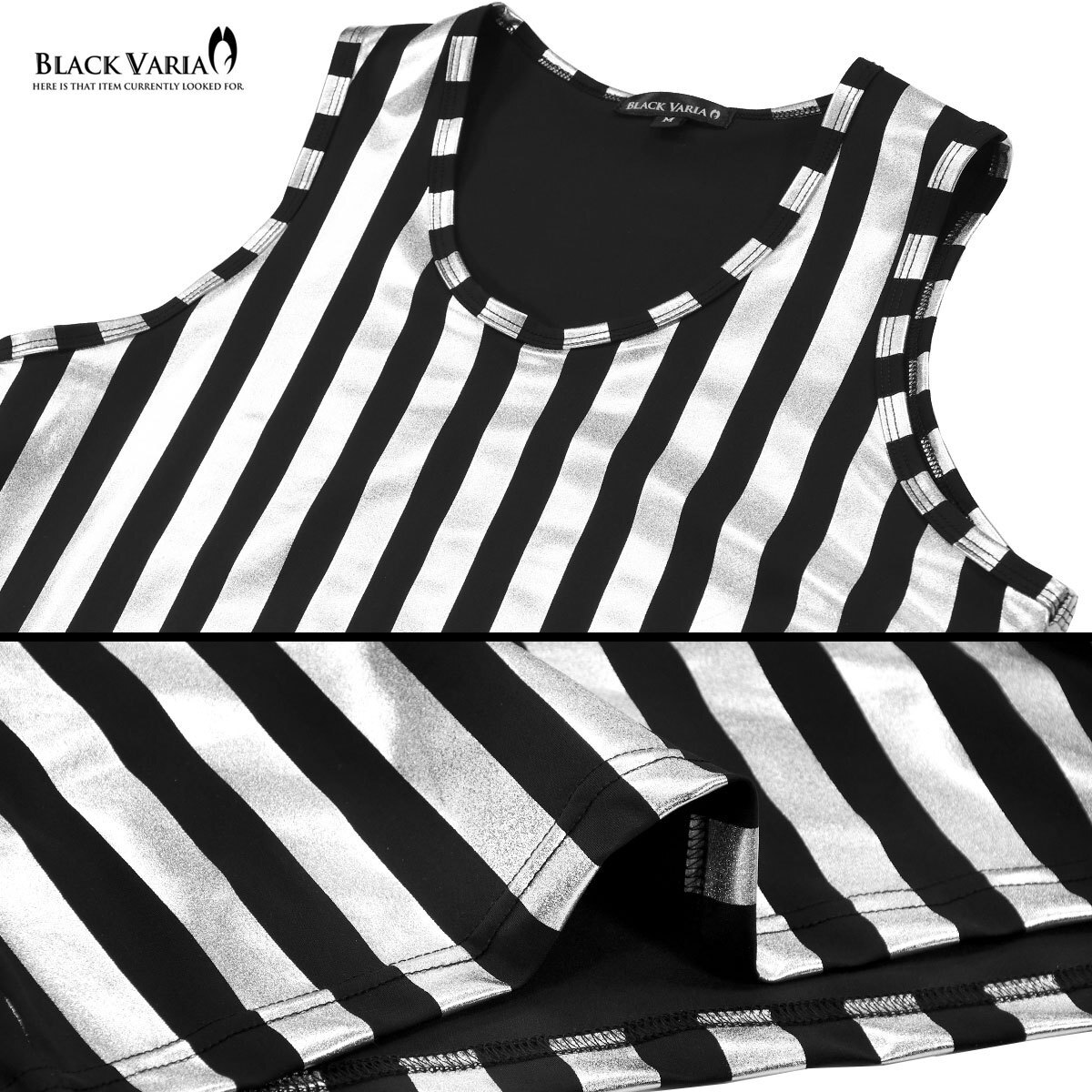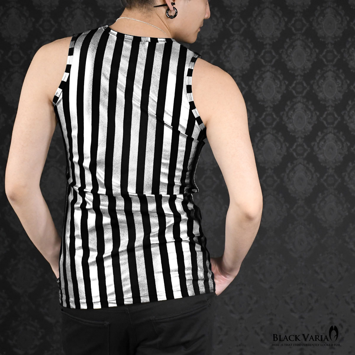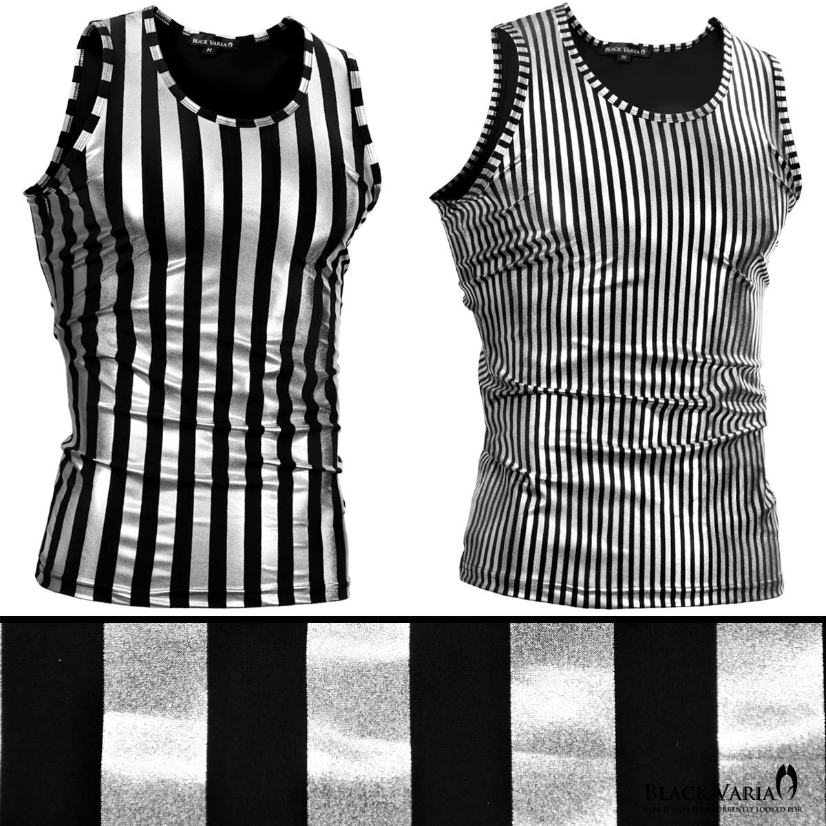 9#193804-bksif BLACK VARIA ロンドンストライプ 箔 光沢 細身 タンクトップ メンズ(太シルバー銀ブラック黒) Mステージ 送料370円~