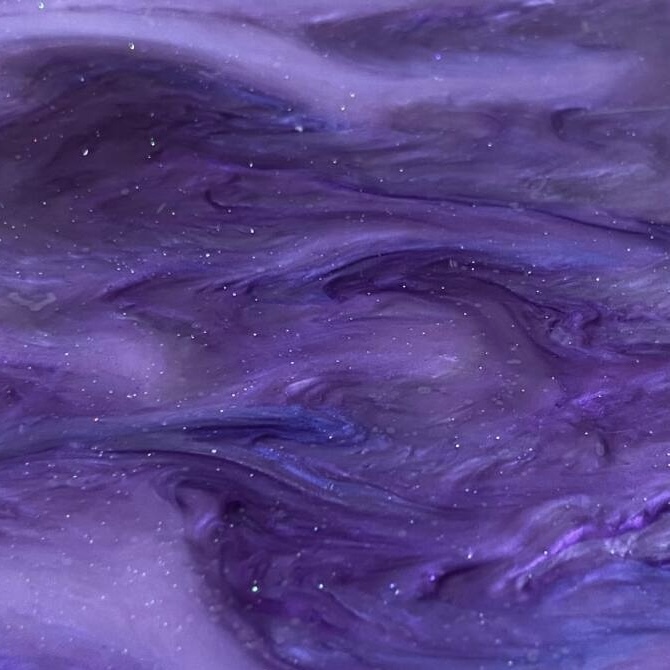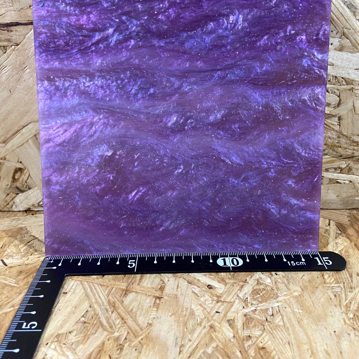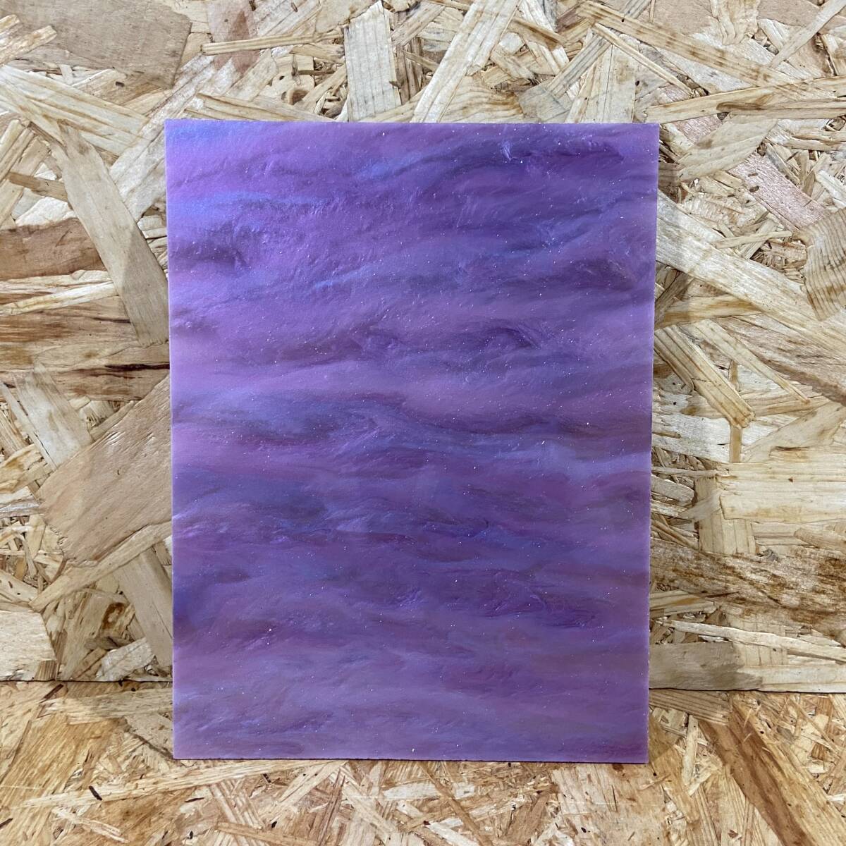 柄物のアクリルパール板です。プレートの表裏の柄は製造過程により模様の出方が違います。片側はパープルベースに濃い紫・青のマーブル流雲柄でラメ入りです。もう方側はそれに比べシンプルな雲模様です。こちらのプレートは金ラメも入っており角度にキラキラしたり、アワビや真珠貝のように角度によって見た目の変化見られます。プレート表面はフラットですが立体感の感じられる柄になっています。