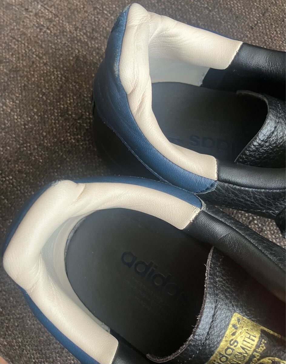 ■現「RECON」のベースとなったと言われるハイエンドラインです。アッパーに上質の牛革をフルグレイン加工した漆黒のコアブラックを採用。ライニングには更に柔らかい牛革を使い履き易さを追求。ヒールにはマッド加工したカレッジエイトネイビーのタブにトリフォイルとスタンスミスのロゴを型押したエンボス加工を施し、シュータンにはゴールドでスタンスミスのシグニチャーパッチをあしらった高級感漂うワンランクアップの大人オシャレなスタンスミスに仕上がっている。