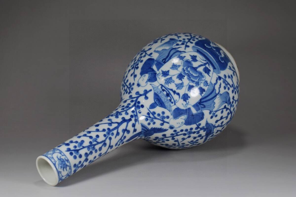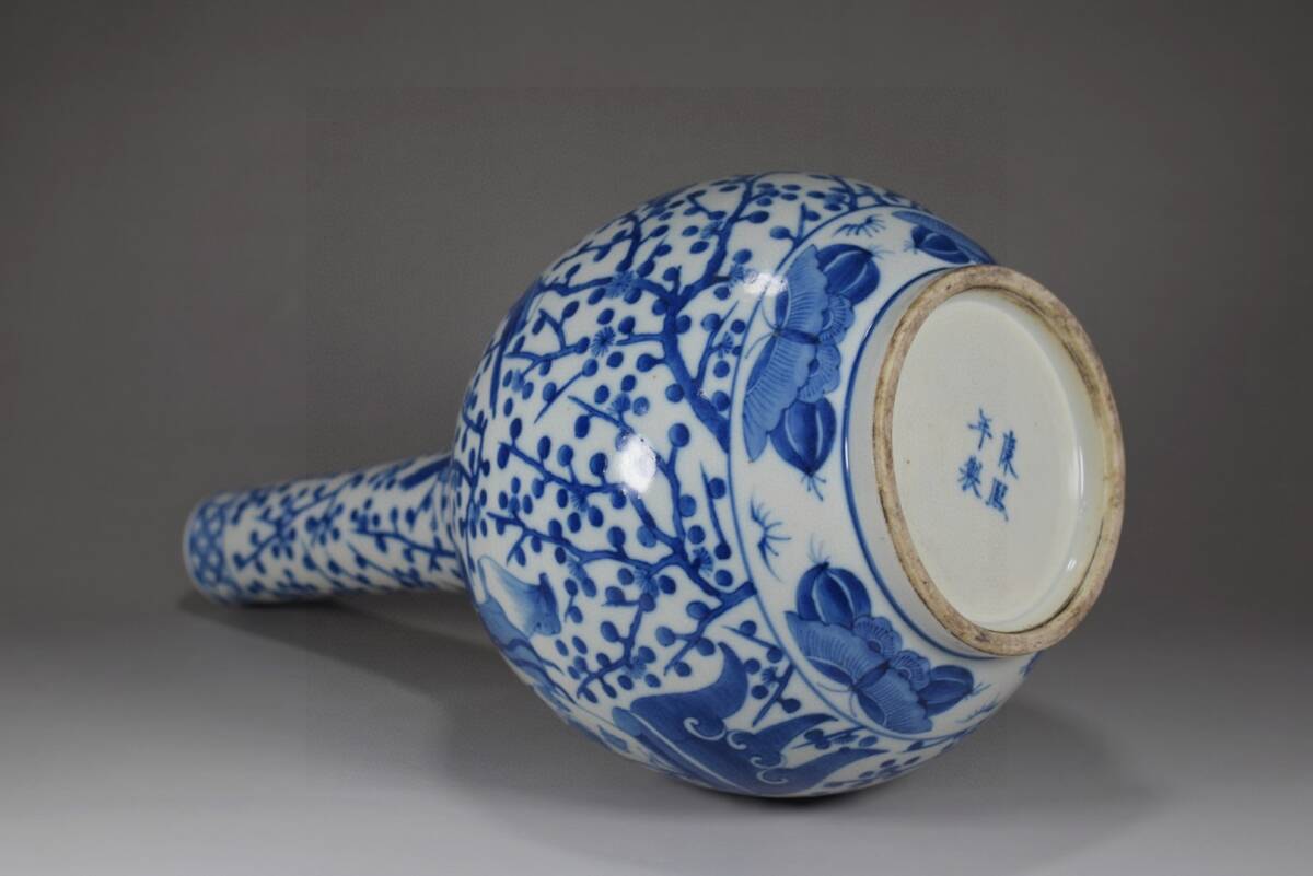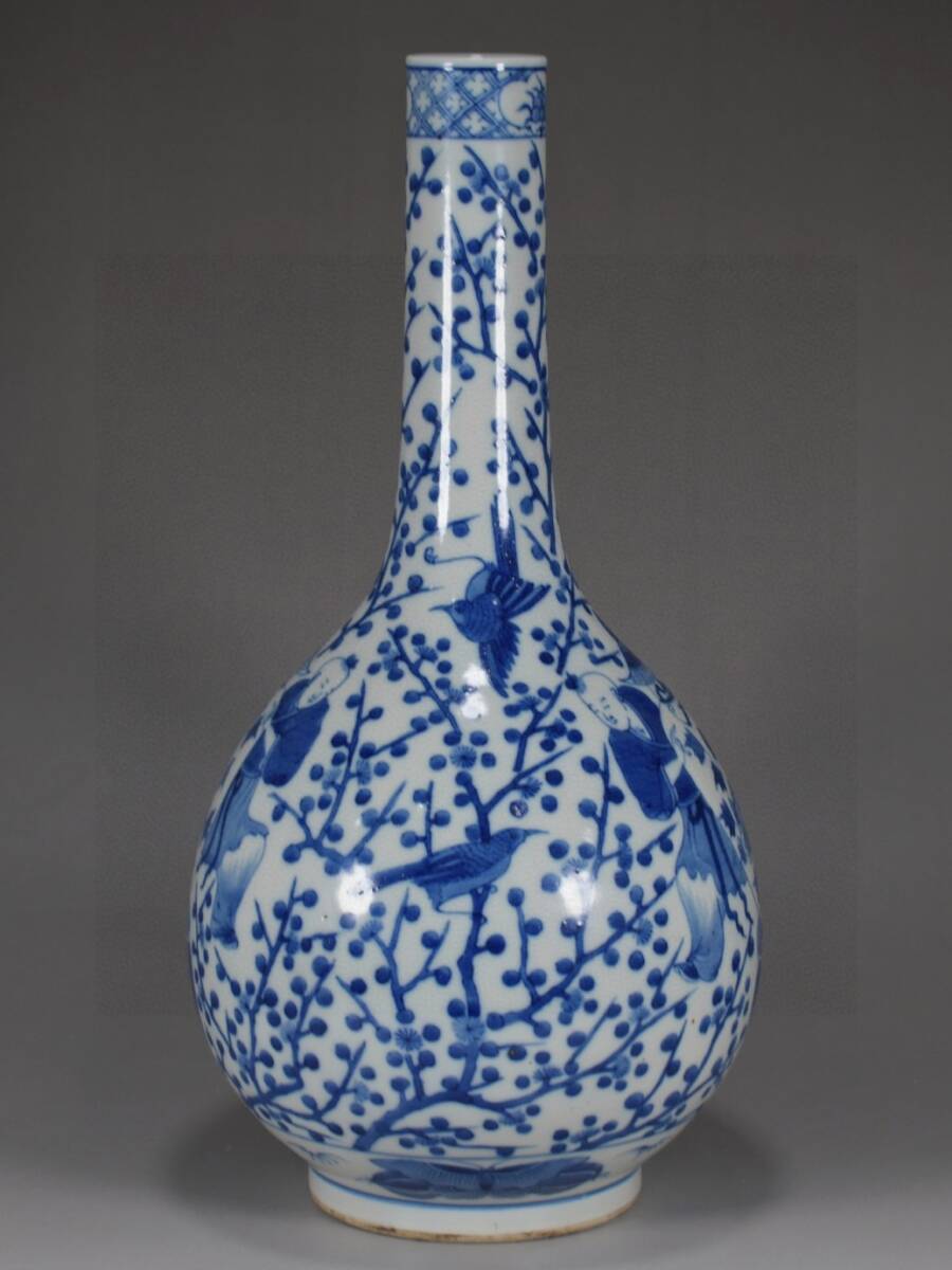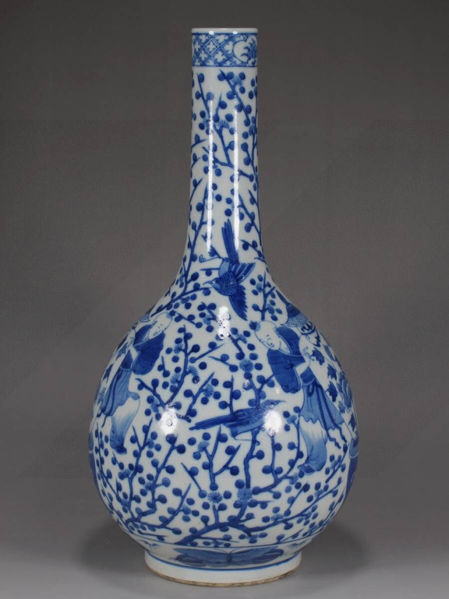 旧蔵 大清 康熙年制 青花 百梅紋 四海升平 長頸瓶 陶芸 磁器 古陶磁器 極細工 中国古玩 骨董品 古美味 207