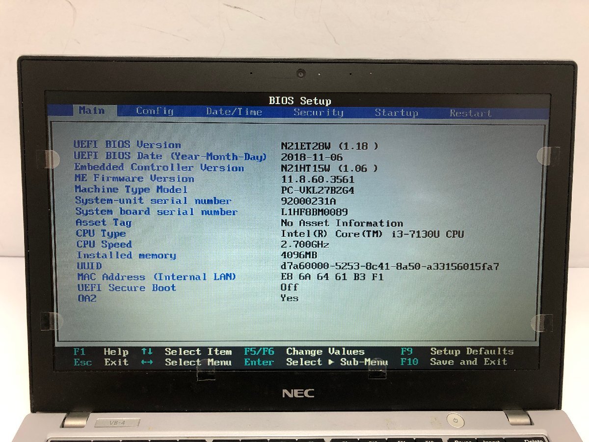 ジャンク/ NEC PC-VKL27BZG4 Intel Core i3-7130U メモリ4.1GB ストレージ無し 【K17197】
