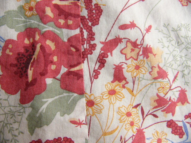 ベージュ地に、くすんだ赤・オレンジ・青・緑のお花柄プリントです。