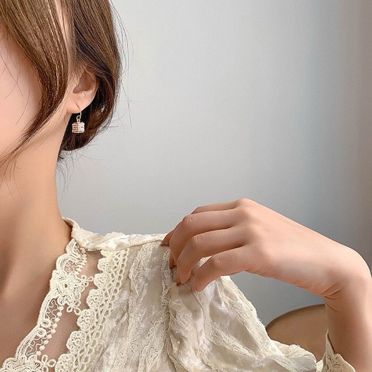 キューブ状に並ぶ小さなベビーパールが女子心をくすぐります。金のフックでどこかアンティーク風。部屋の小物ディスプレイにしても映える、おめかしデザインです。