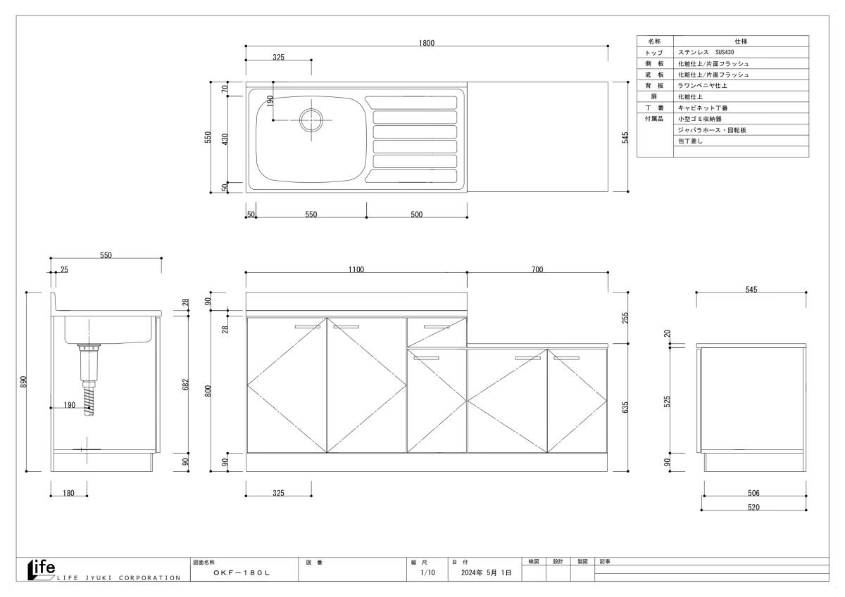 【ライフ住器】OKF-180L 公団型流し台 1800×550 アイボリー【日本製】