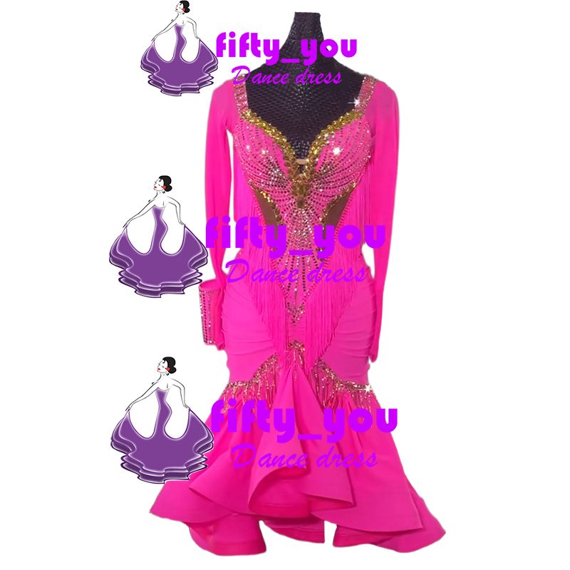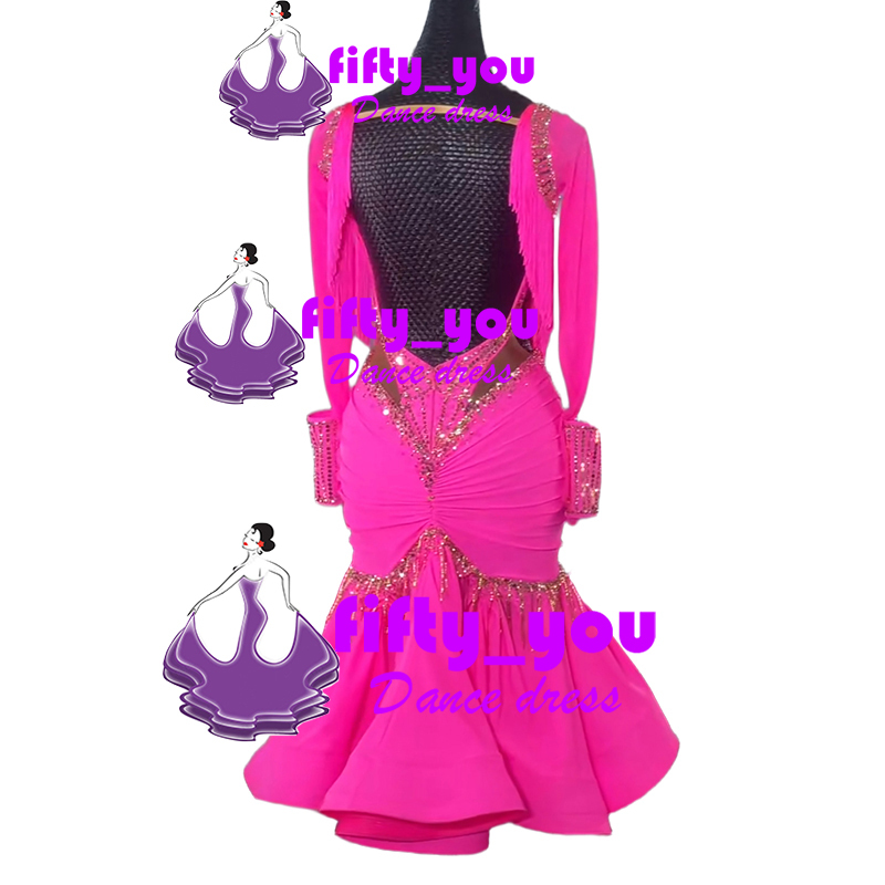 新品fifty_youセミオーダードレス レディース社交ダンス競技衣装 ラテンドレス パーティー用お洒落デザイン ビーズ飾り ピンク