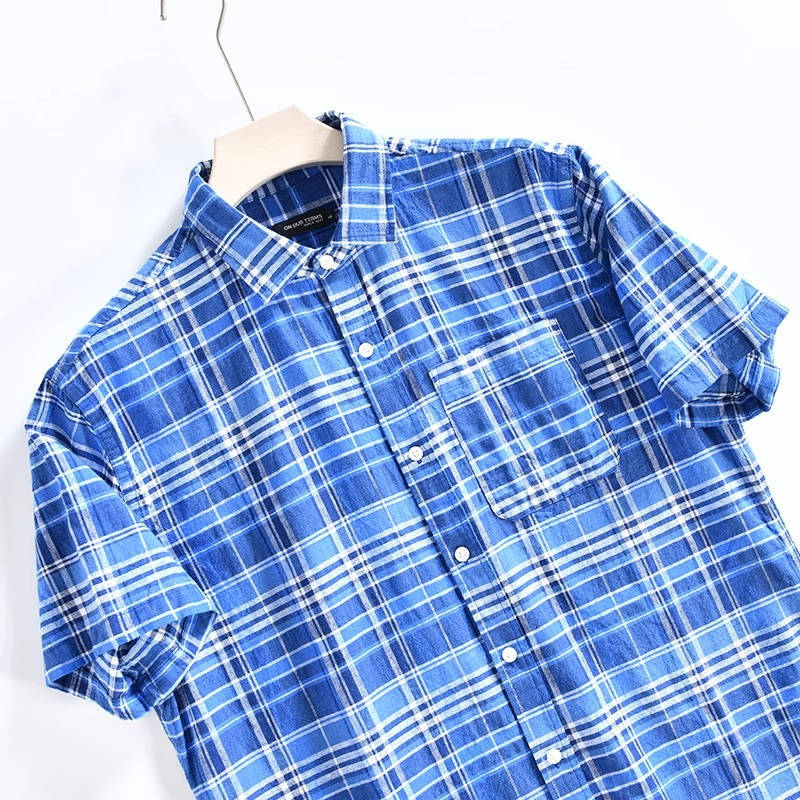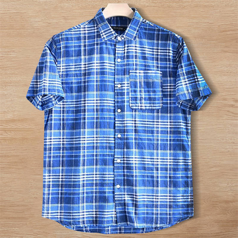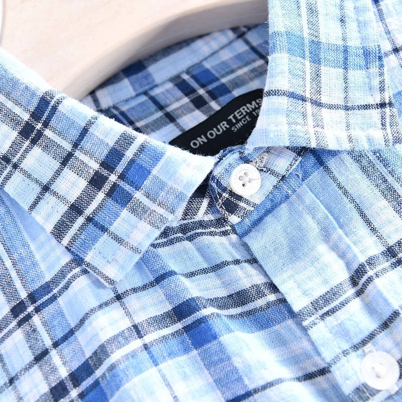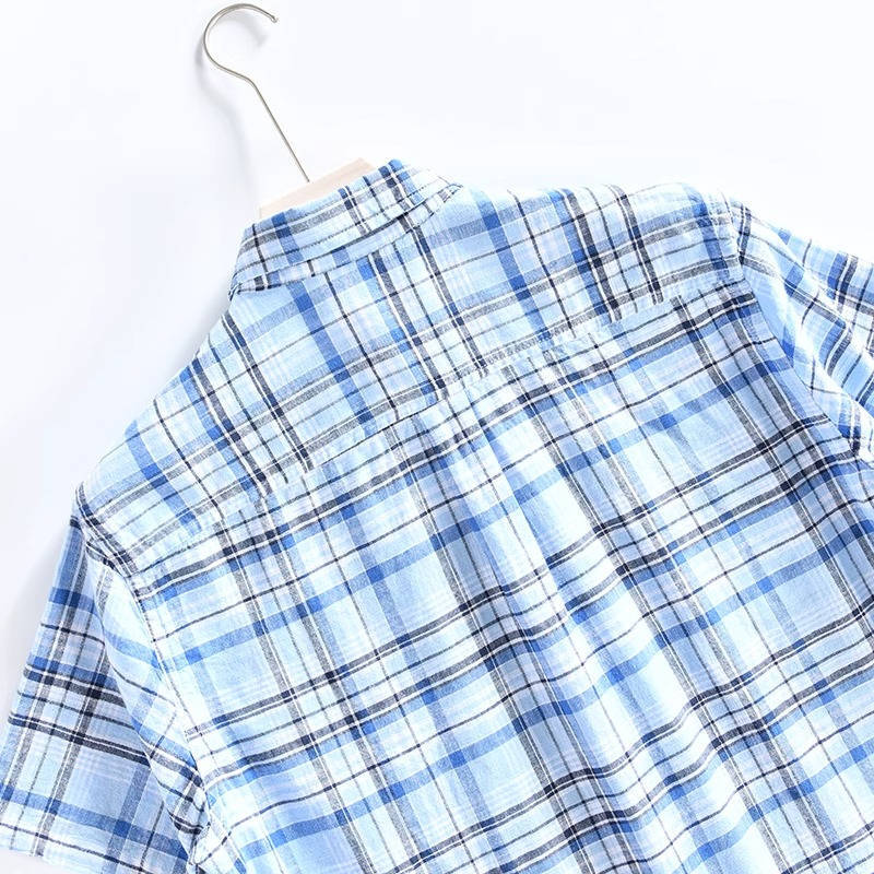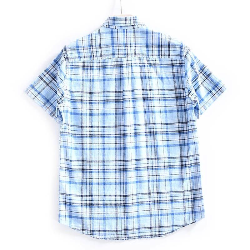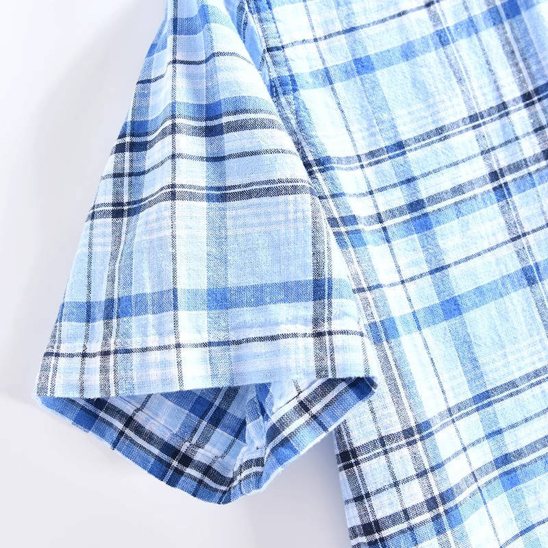 暑い季節に快適な着心地を提供する、綿麻混素材のチェック柄カジュアルシャツ。