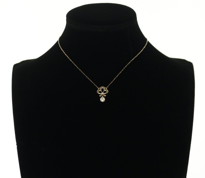 中央にメレダイヤを添えた艶やかなゴールドのオープンワークデザインに上質なテリ煌めきを披露するミキモトセレクトのアコヤ真珠が揺れ輝きを演出するネックレスです。 |