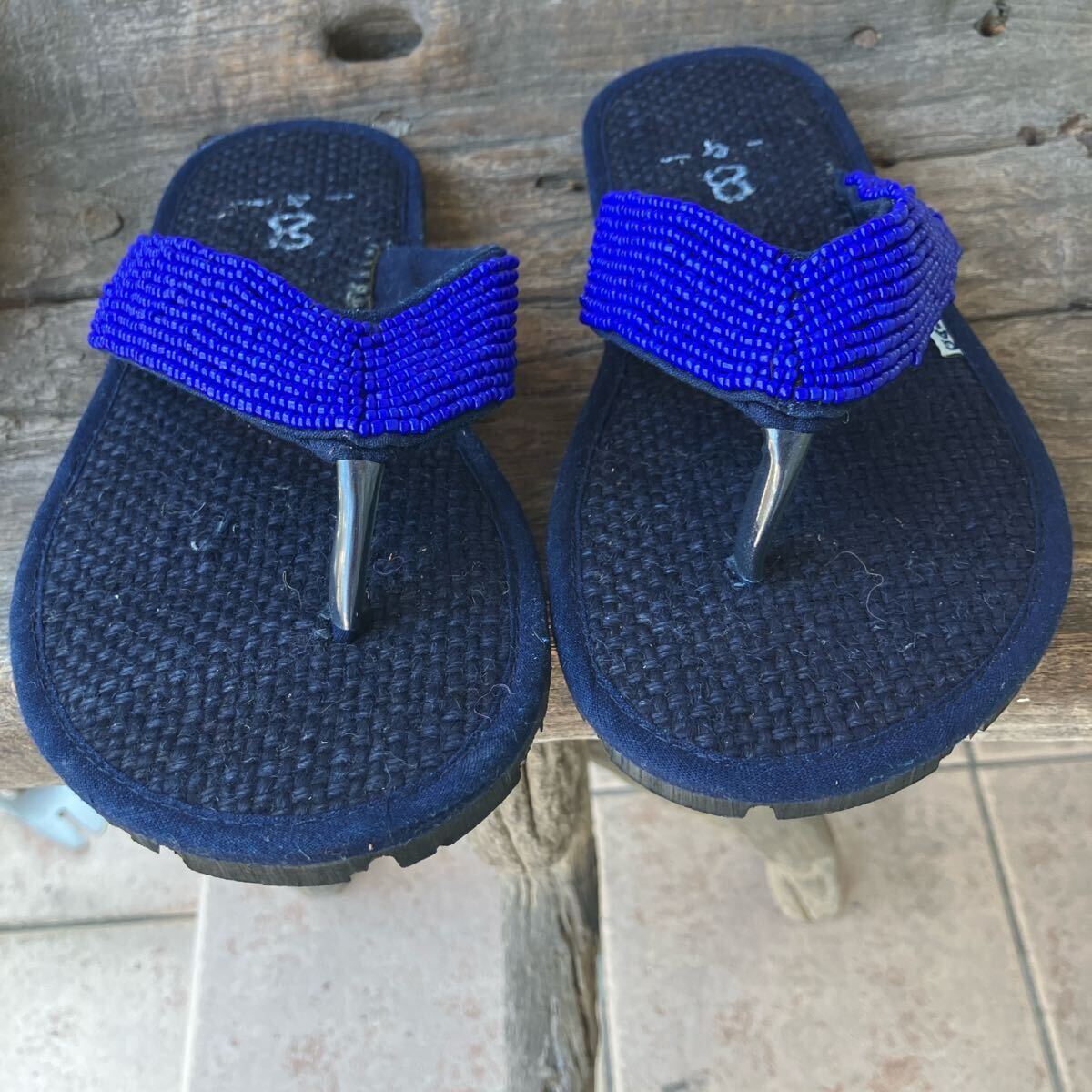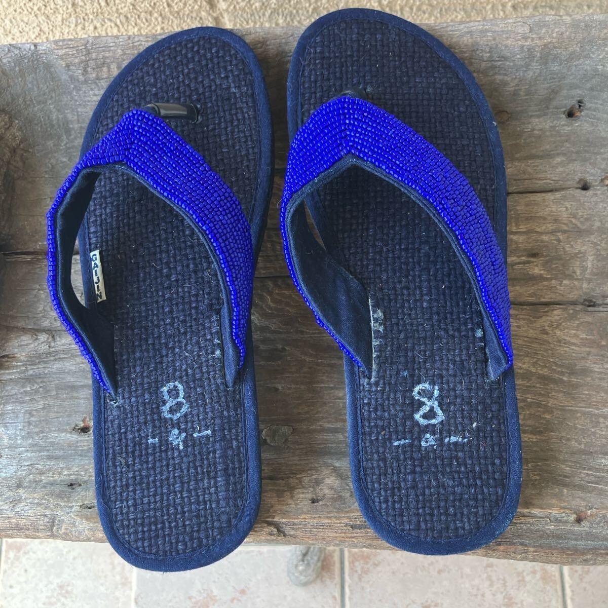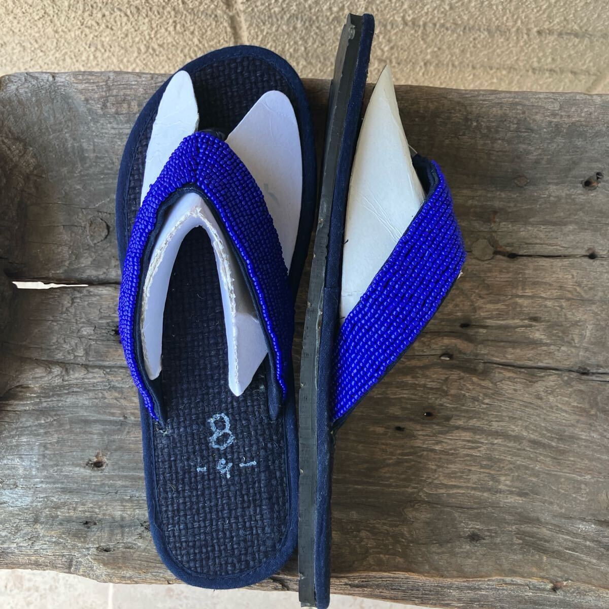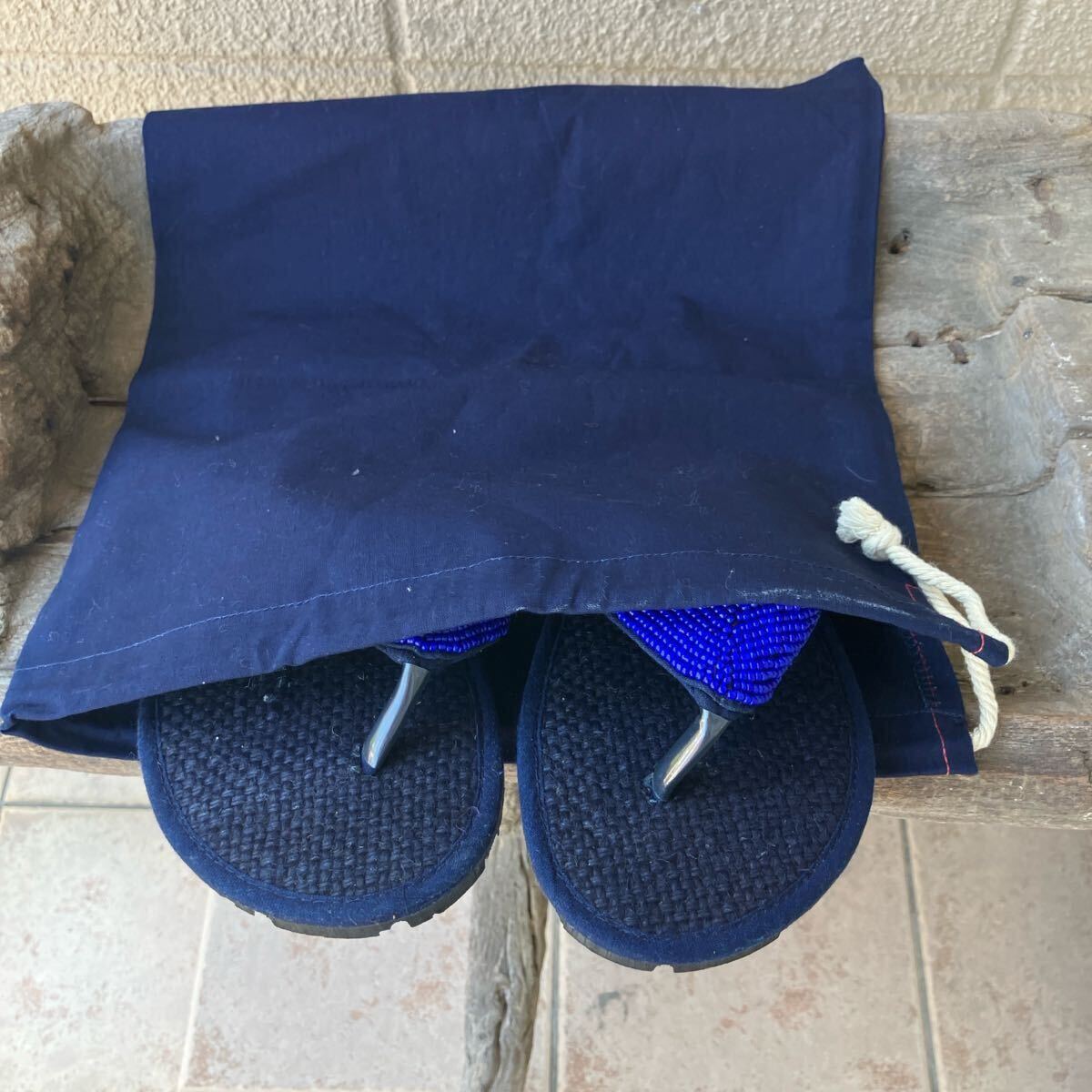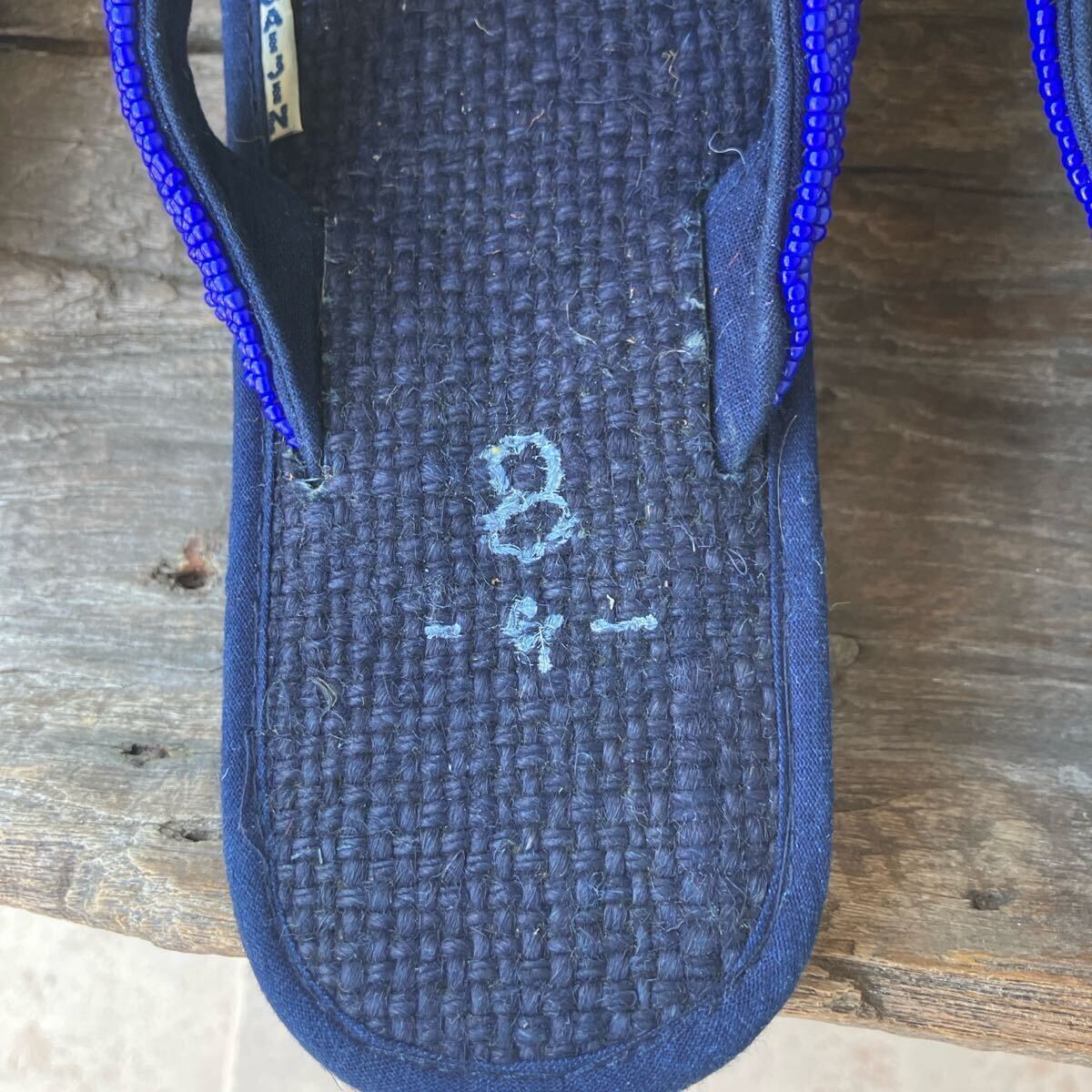 鼻緒に使用のビーズはカレンのアクセサリーより供給されたものを使用、ソールに敷き詰めたジュートは天然藍染めされた生地を使用、お馴染みの古タイヤを底に使用致しております。