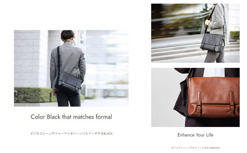 「すべてを革で」との想いで作られたこのショルダーバッグ、本体素材と同素材を使ったショルダーベルトはギボシ金具で長さを調整いただけます。長さは103cmから135cmの9段階調整が可能で各ギボシの間隔は約4cmとなり、センター部分には滑り止めがついています。底面に沿うように自然とアールがつくよう工夫されたフラップベルトは、フラップ裏面のマグホックを利用することで金具に通さず垂らしたままのラフな印象でお使いいただけます。もちろんバックル金具を通す使い方はもちろん、革ループに通すだけという使い方もおすすめです。また、かぶせ部分はできるだけフラットに、ただ本体は少し柔らかさを持たせたい、そんな想いを実現するため革の厚みを最適化するなど職人の工夫が込められています。収納はオープンポケットが二つ、ペンさし、ファスナーポケットとシンプルな仕様で、A4クリアファイルがジャストで入る大きさです。ブランドアイコンは、ショルダーベルトをとめるギボシ金具のFUJITAKAと、かぶせを開けたところの本体中央にFUJITAKAの素押しロゴが入っています。