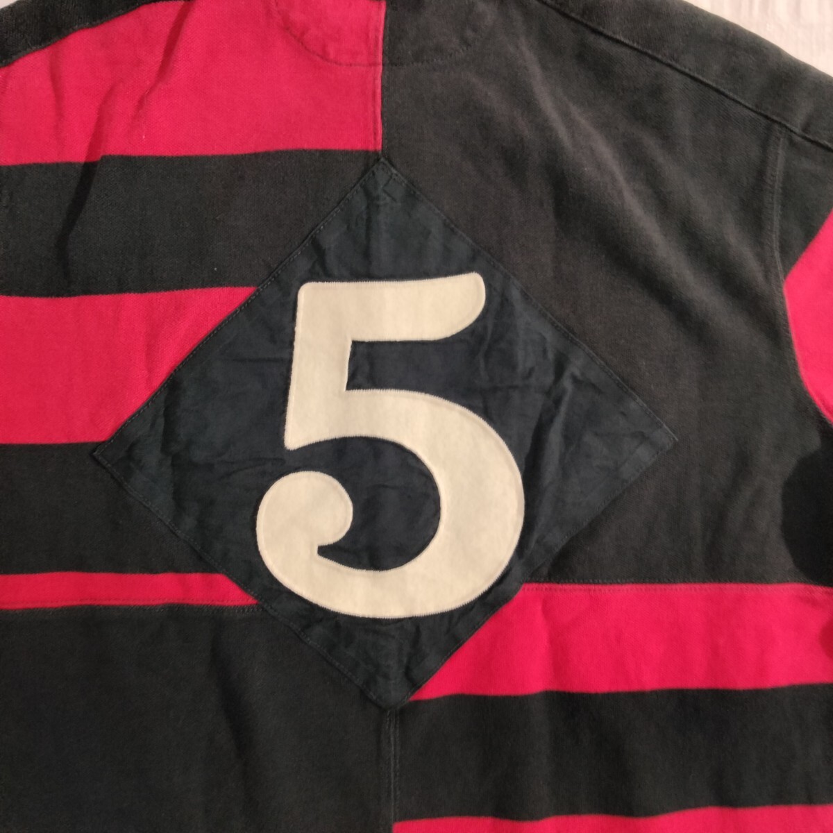 鹿の子生地 フライ部ラグビーシャツのように生地補強。肩上鹿の子生地補強ステッチ。右胸 布帛生地 エンブレム。後布帛生地にフェルトワッペン。カスタムフィット。