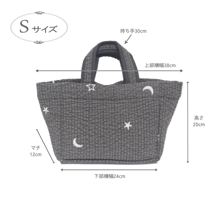| サイズ | バッグ横:上部38cm下部24cm 高さ:20cm マチ:12cm 持ち手:30cm 内ポケット:約幅19x深さ12cm |