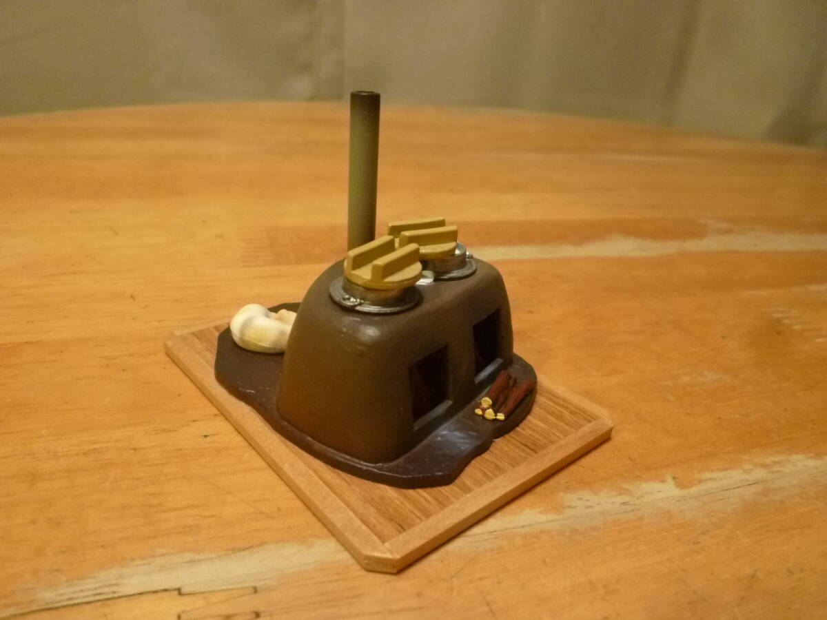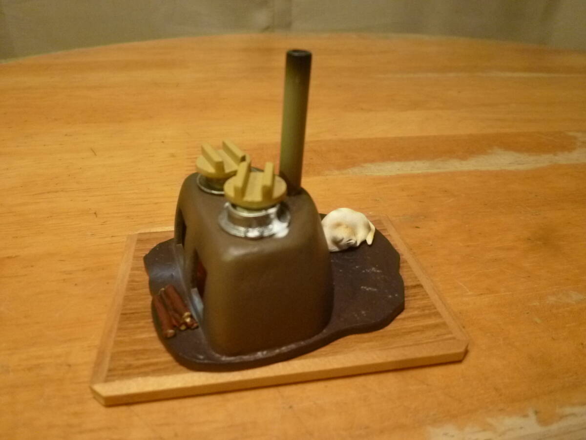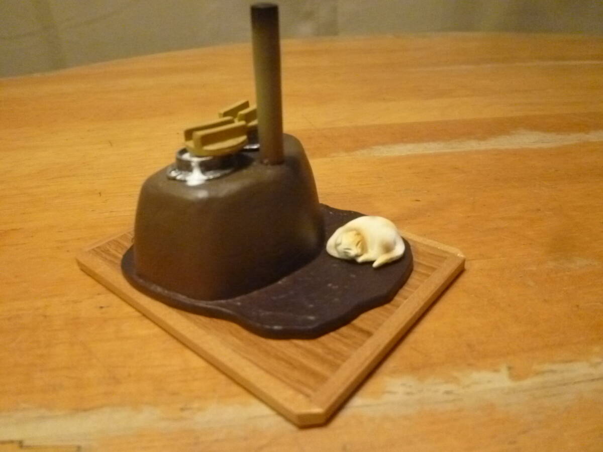 こちらはインテリアとしても人気の ぷちサンプルの かまどでの炊きあがったお釜のごはんと寒がりの昼寝の猫の様で、お釜の一つは吹きこぼれ、もう一つはもうしばらくの様で、かまど内は赤々と燃え、焚口にはマキも見えます。