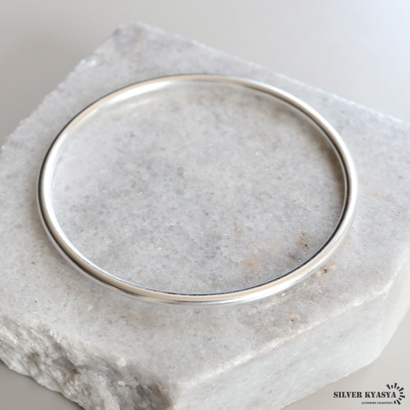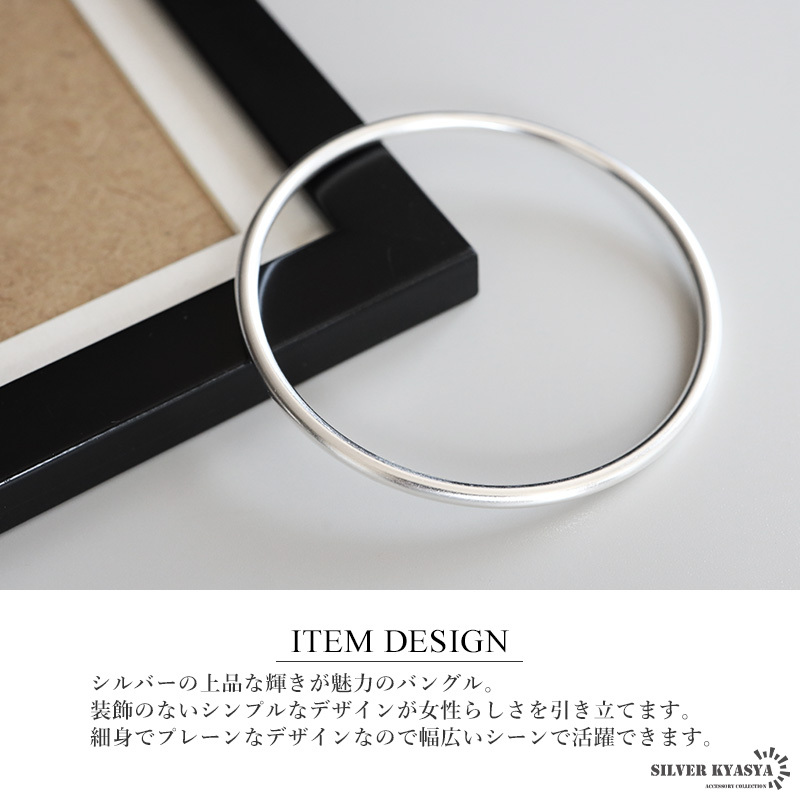 シルバーの上品な輝きが魅力のバングル。装飾のないシンプルなデザインが女性らしさを引き立てます。細身でプレーンなデザインなので幅広いシーンで活躍できます。