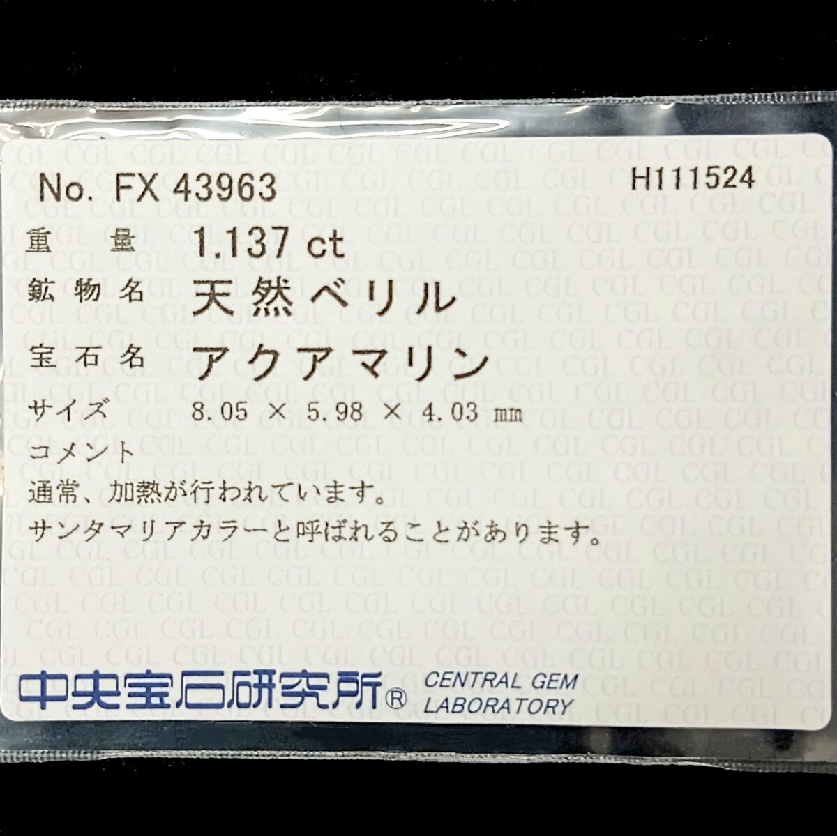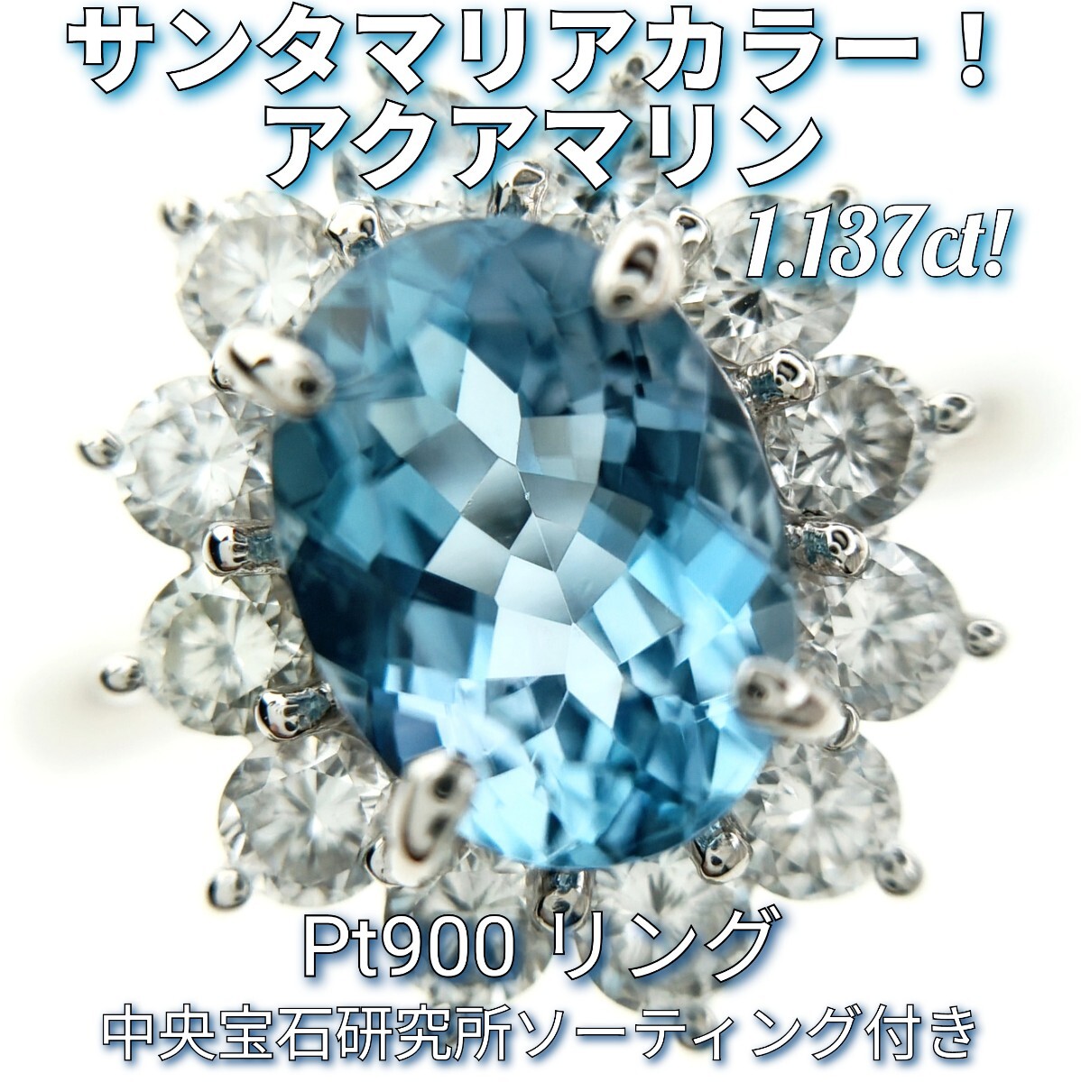 ☆サンタマリアカラー!アクアマリン☆1.137ct / ダイヤモンド 0.60ct Pt900 リング 中央宝石研究所ソーティング付き ☆新品同様磨き☆